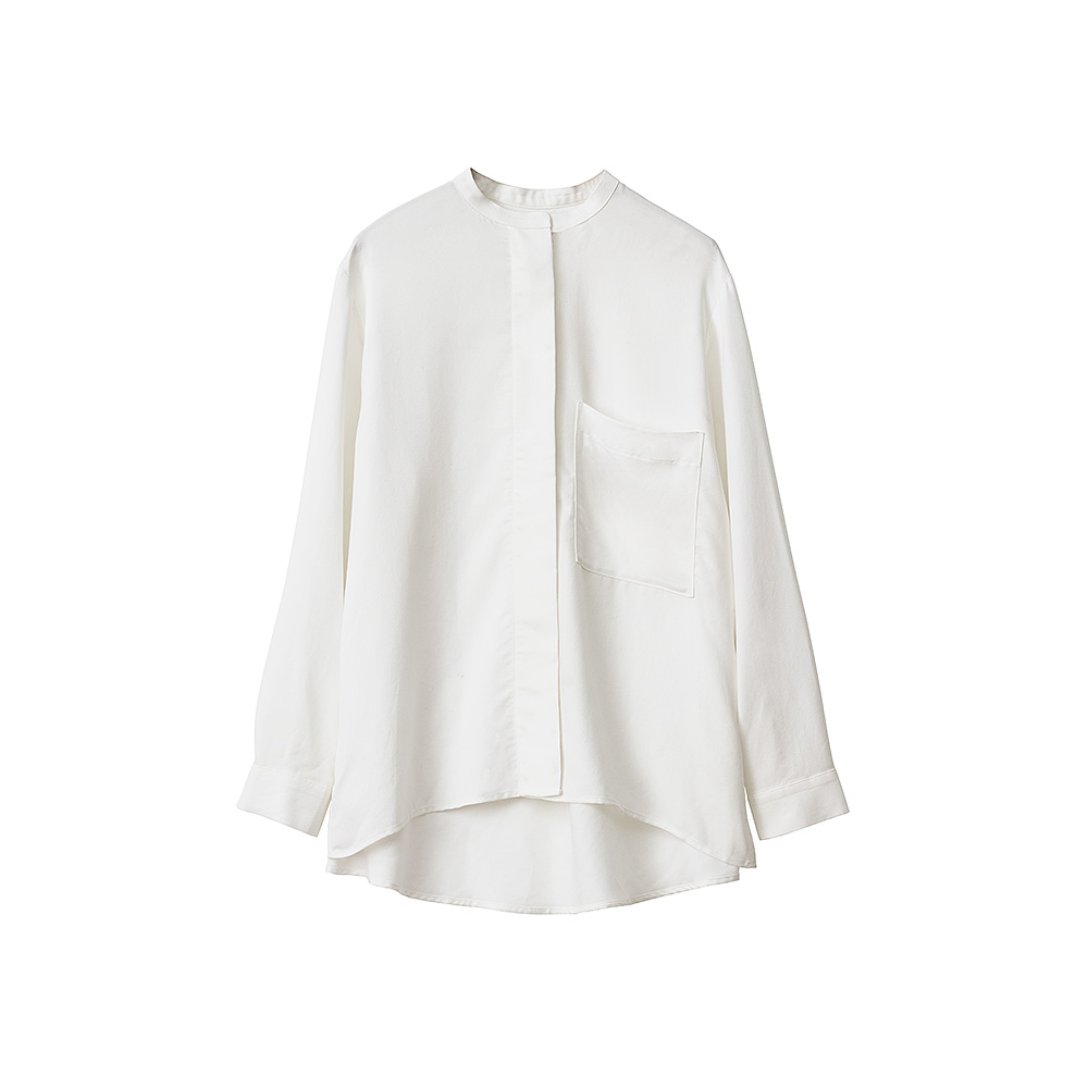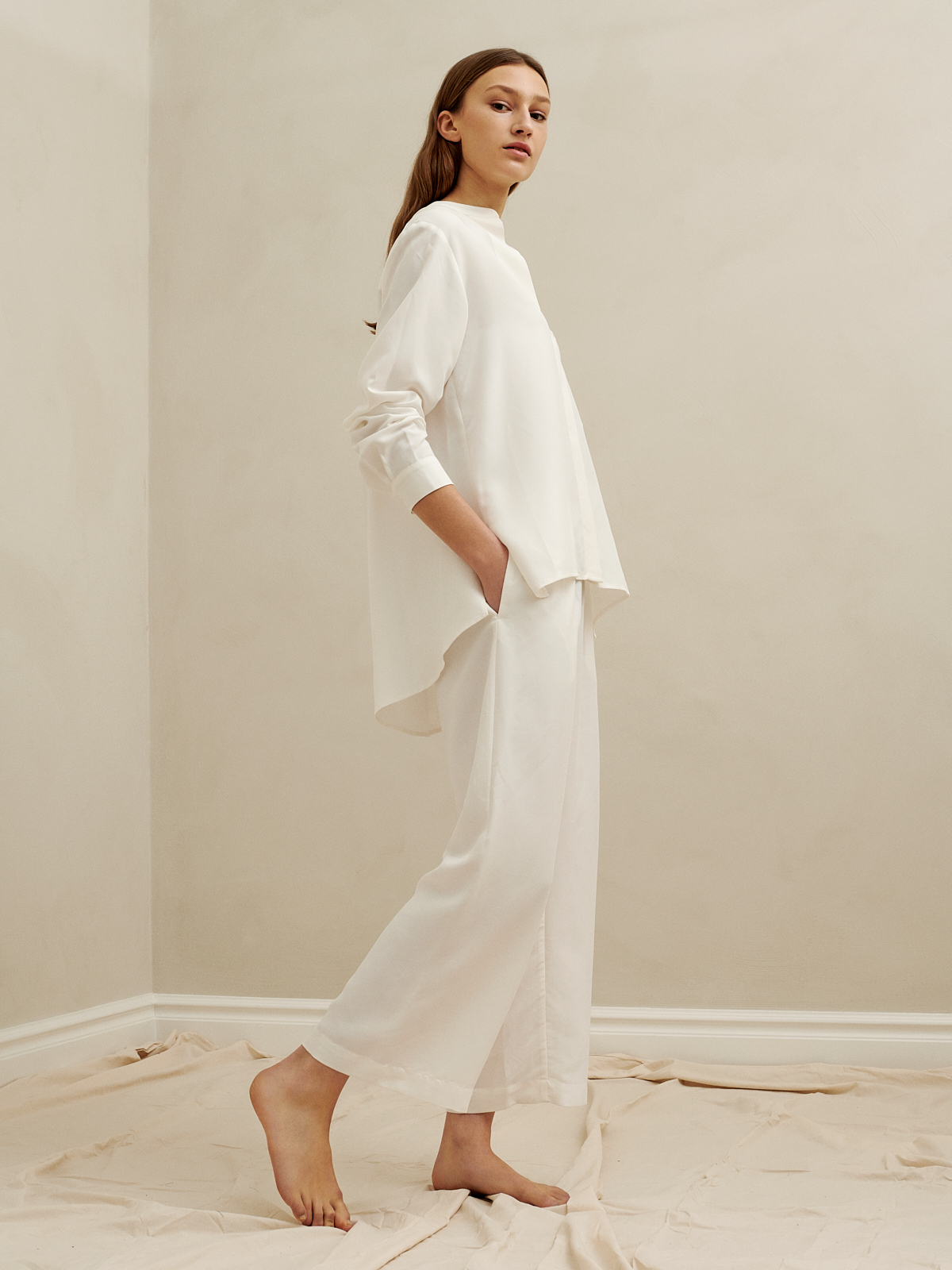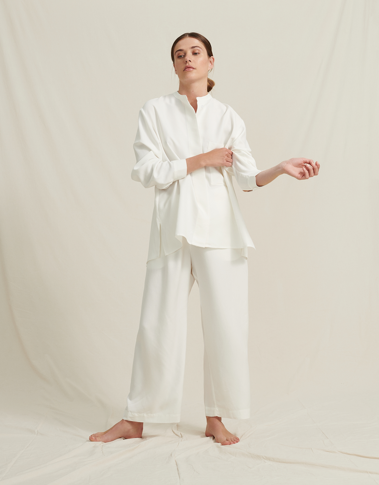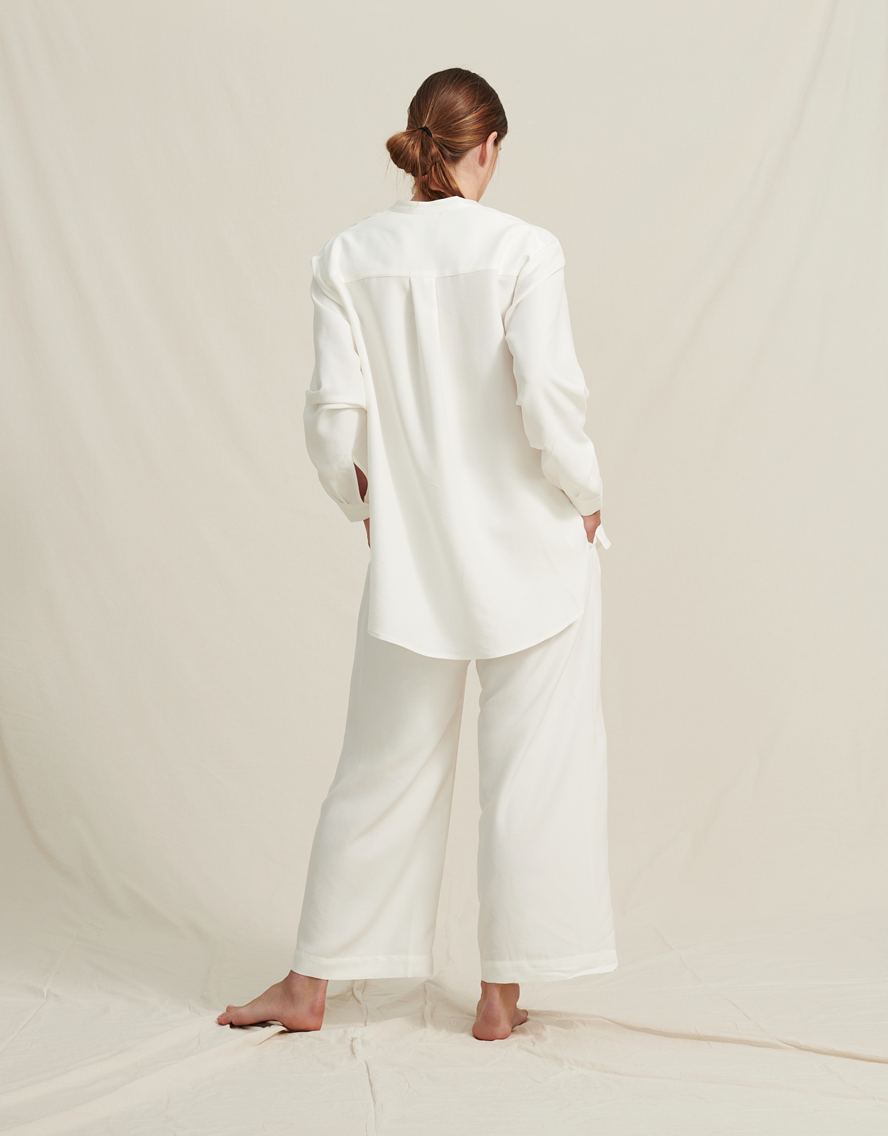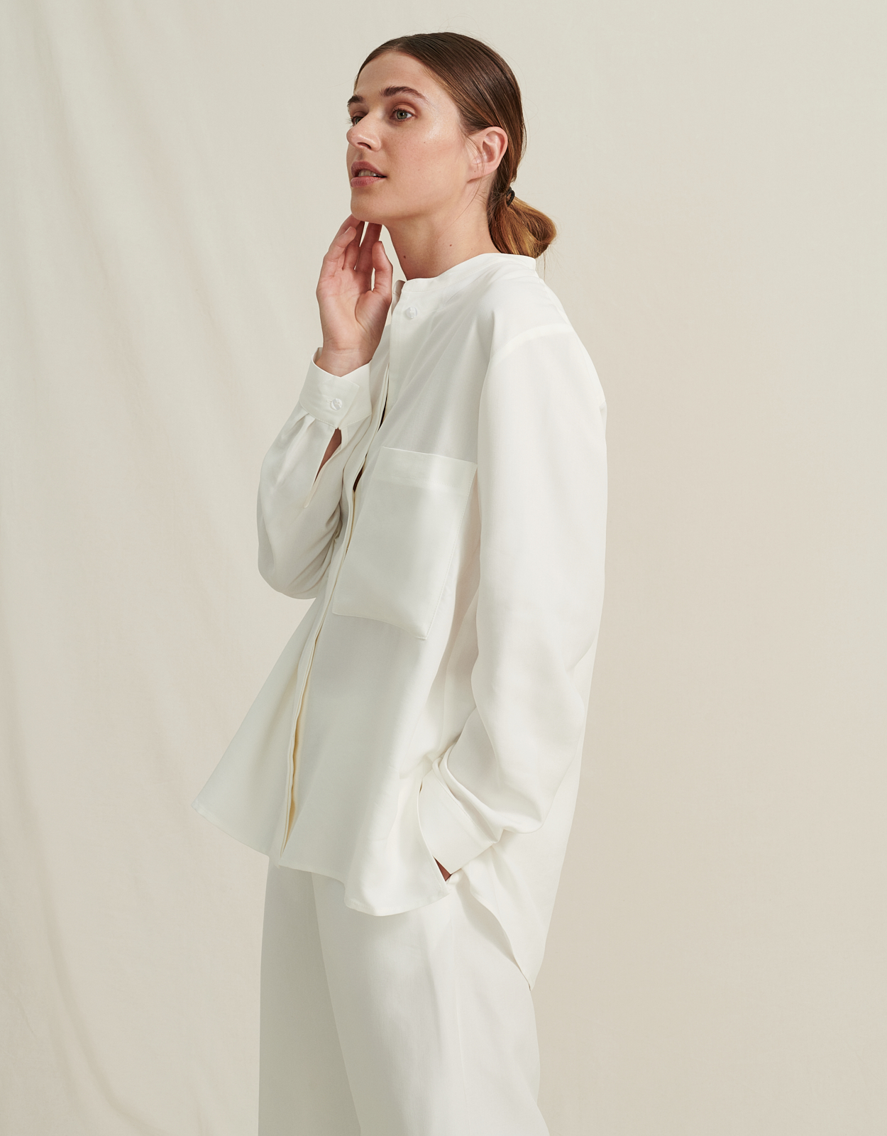 Naisten paita. Ilmava ja moderni valkoinen A Part of the Art kauluspaita. Veistoksellisessa paidassa on nappikiinnitys, A-linjainen leikkaus joka takaa pidempi sekä päälleommeltu rintatasku. Kaulukseton.