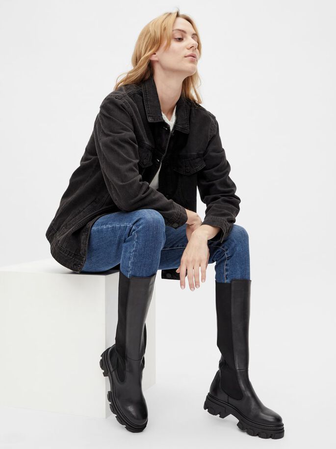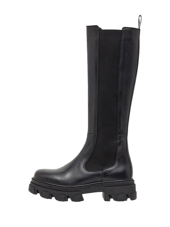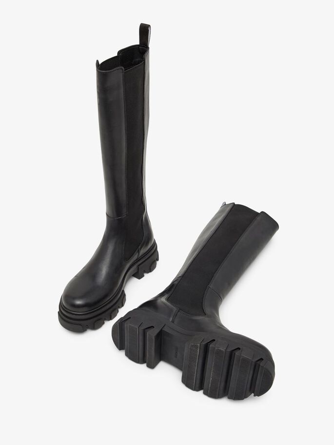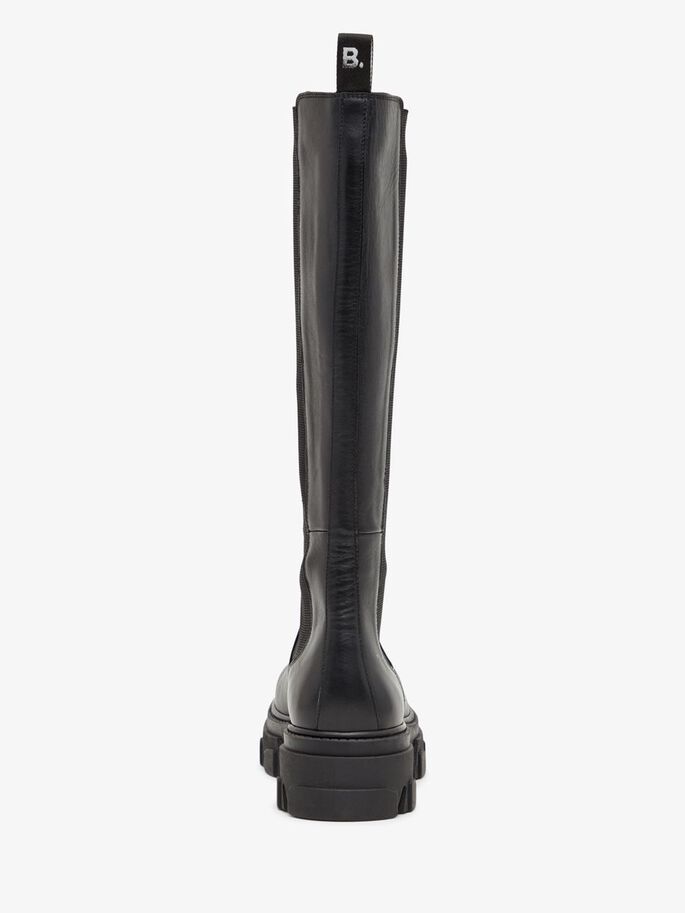 Naisten kengät. Paksupohjainen, extra-korkea Bianco nahkasaapas. Trendikkäässä saappaassa on korkea pohja sekä pukemista helpottava resori. Pyöreä kärki.