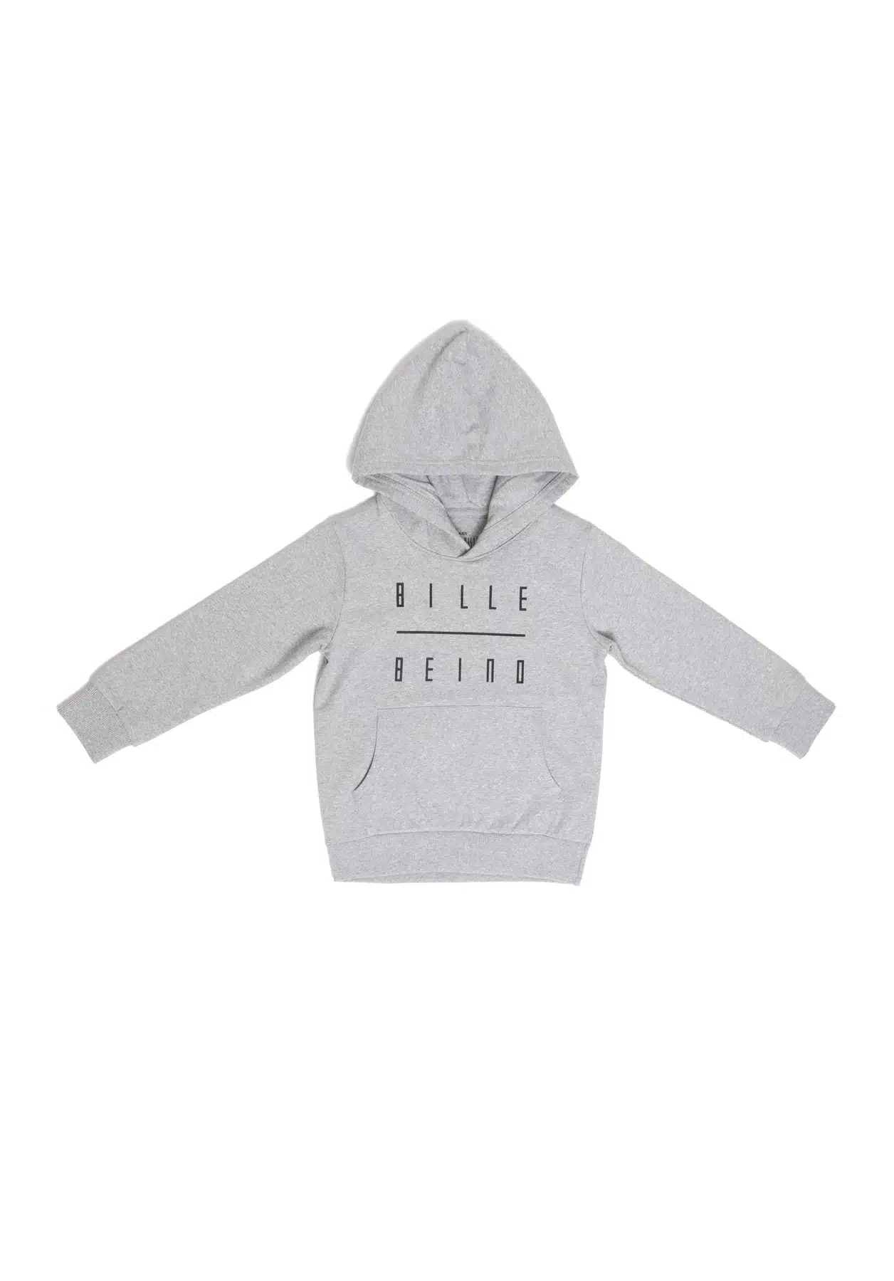 Lasten/nuorten huppari. Billebeino lastenmalliston harmaa logohuppari on valmistettu kierrätysmateriaalista. Hupparissa kengurutasku edessä sekä rinnassa Billebeino logo.