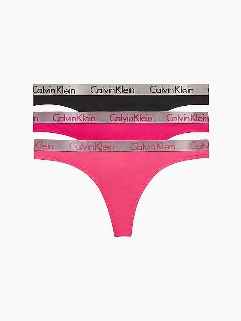Naisten alushousut. Kolmen pakkaus mukavia Calvin Klein stringejä. Joustavassa, metallinhohtoisessa vyötärönauhassa Calvin Klein logo. Keskikorkea vyötärö.