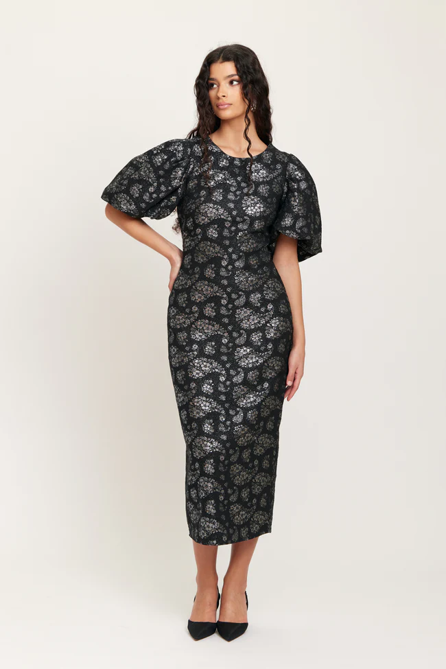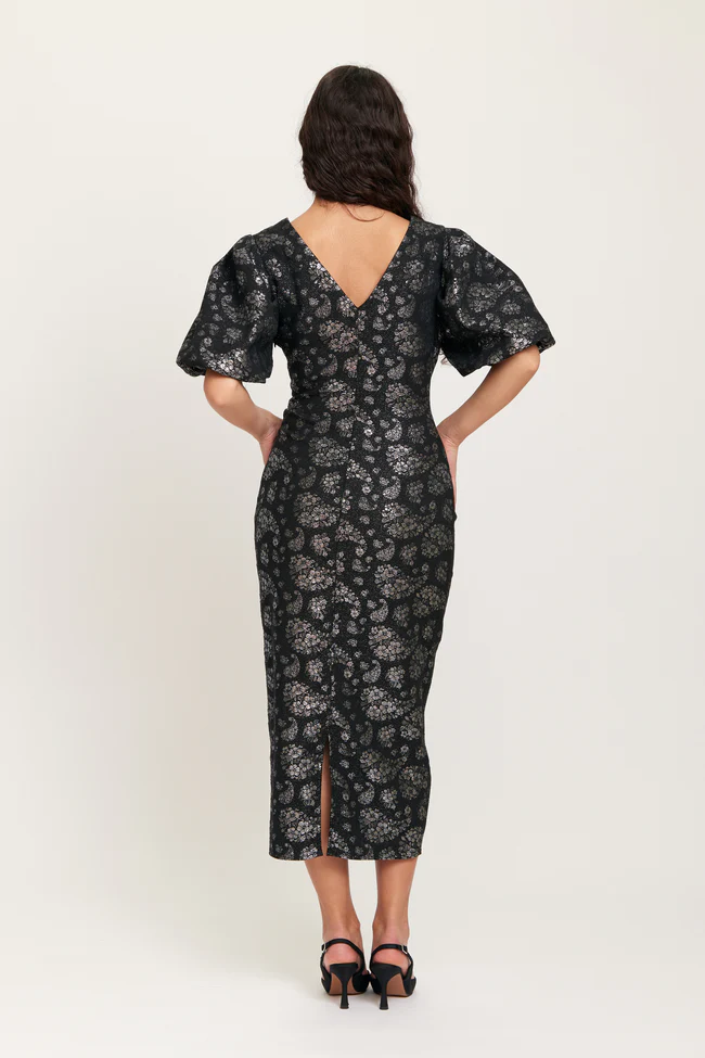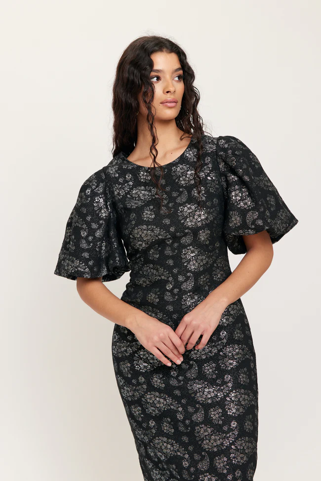 Näyttävä Dry Lake juhlamekko hopeanhohtoisella tone-to tone kuosilla.