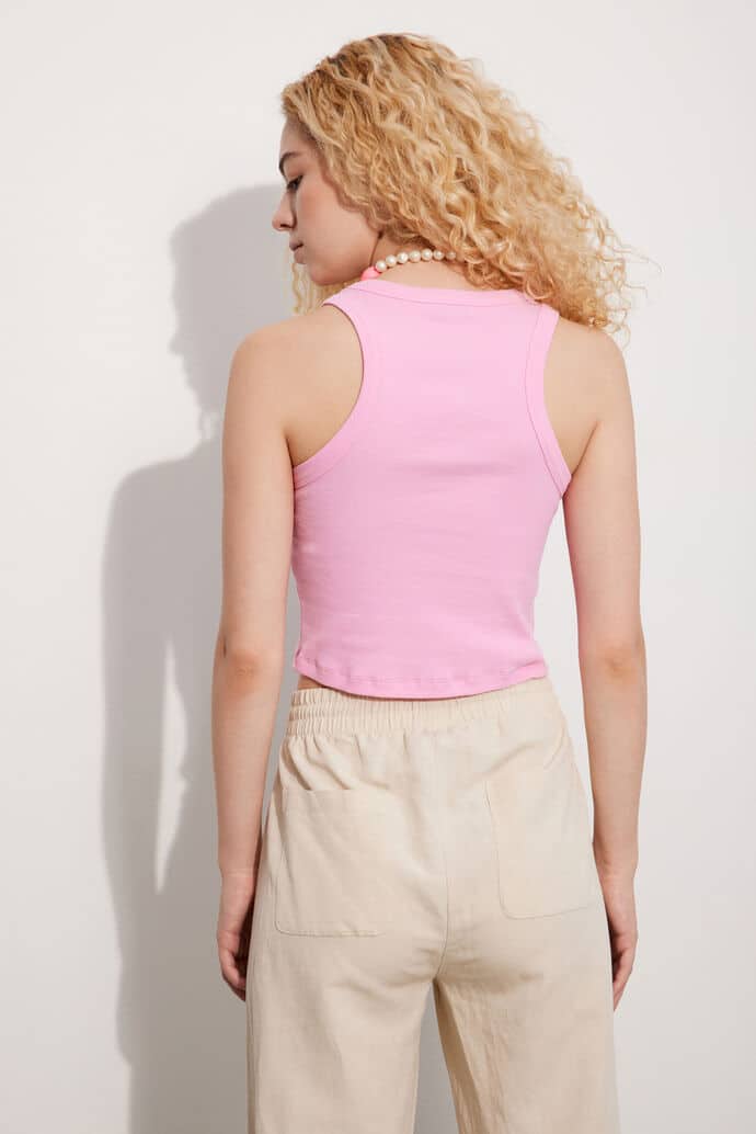 Naisten toppi. Painijanselkäinen cropattu Envii ribbitoppi on pehmeää luomupuuvillaa. Tyköistuva malli jossa pyöreä pääntie.