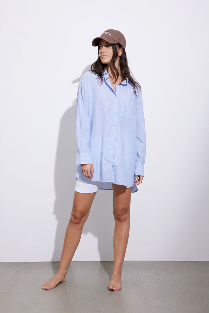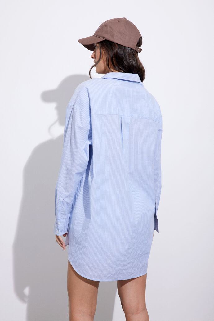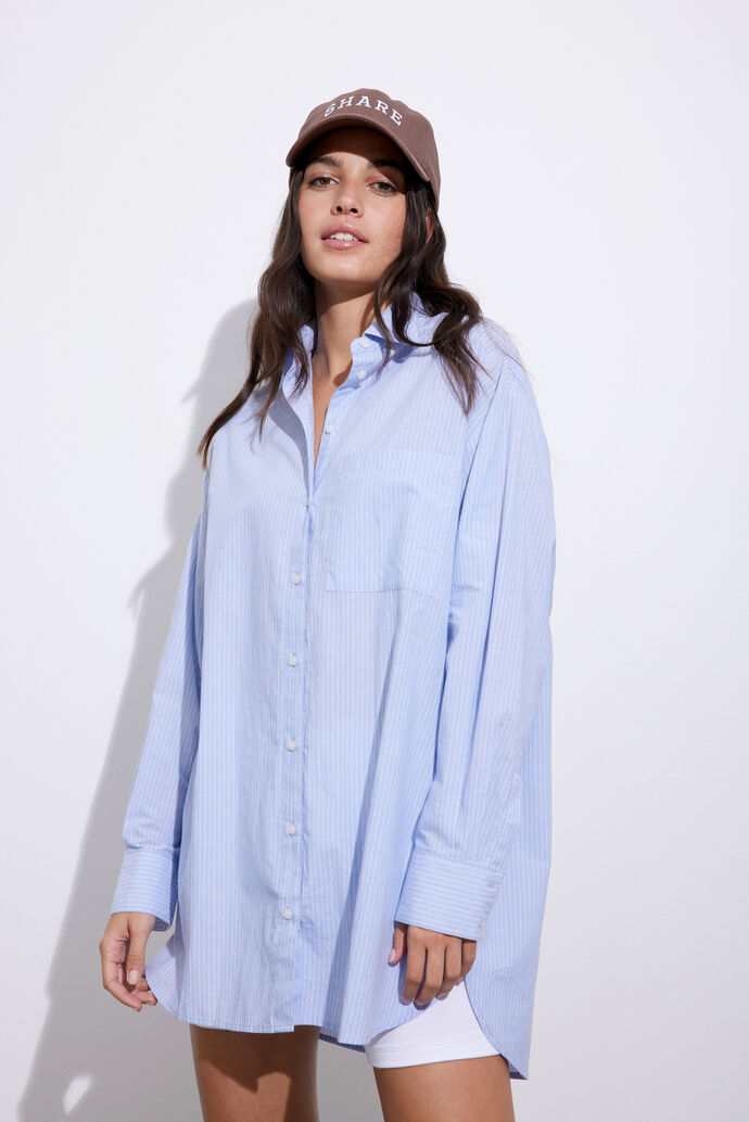 Naisten paitapusero. Oversized “boyfriend” paitapusero on pehmeää puuvillaa. Väljässä ja pitkässä puserossa on nappikiinnitys, raitakuosi sekä rintatasku.