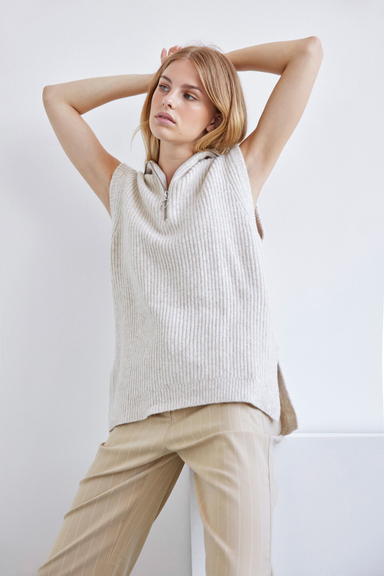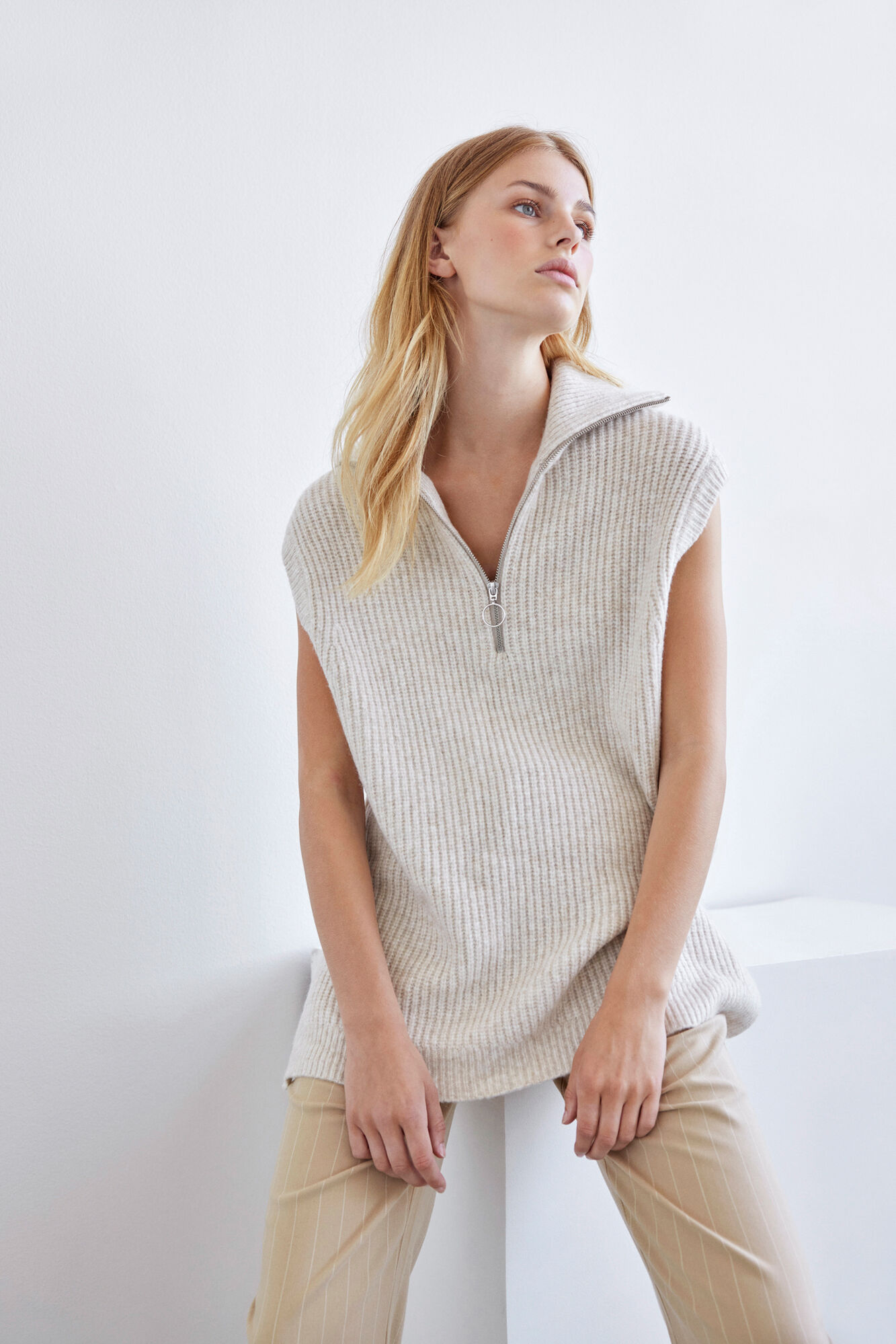 Trendikäs, muhkea Envii neuleliivi vetoketjukauluksella.