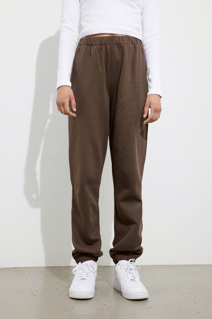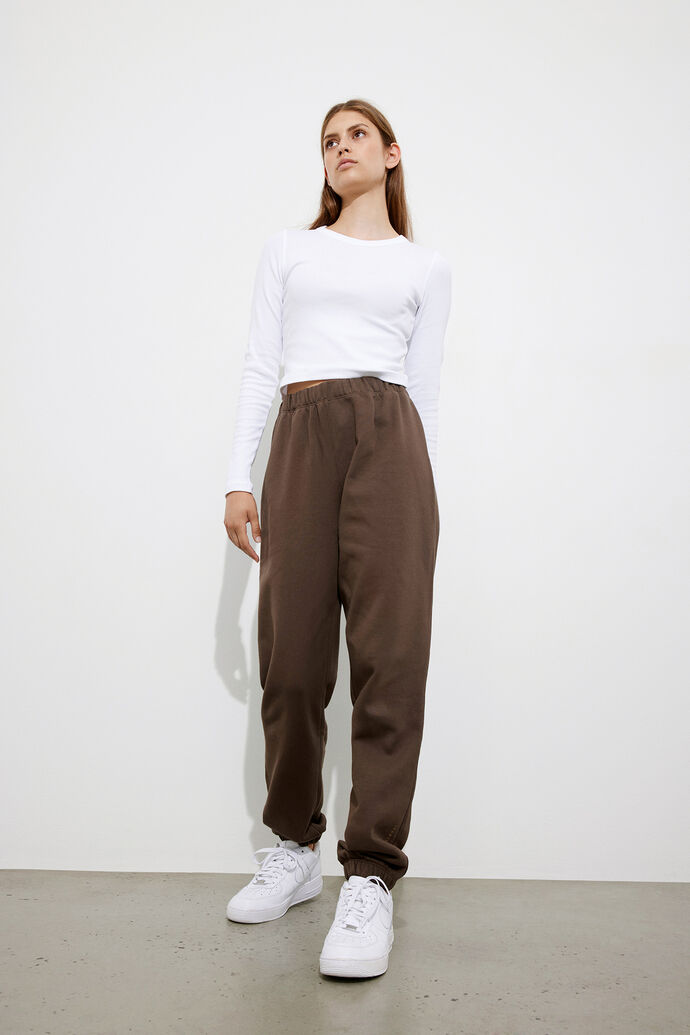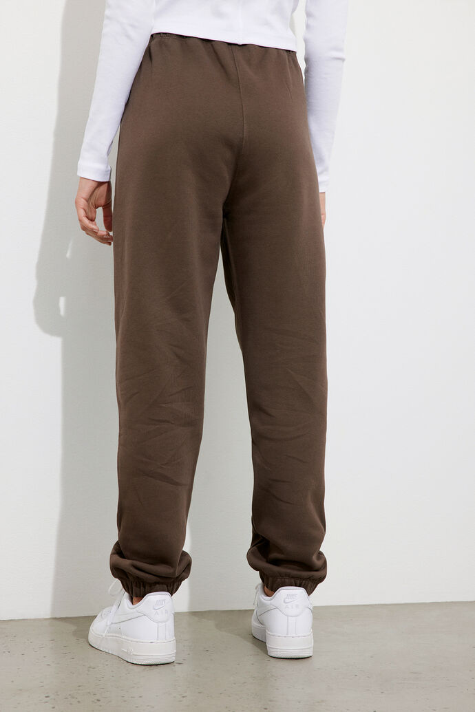 Naisten collegehousut. Rennot, pehmeät Envii joggersit ovat luomupuuvillaa. Collegeissa on säädettävä vyötärönauha sekä joustavat lahkeensuut. Lahkeensuussa logo.