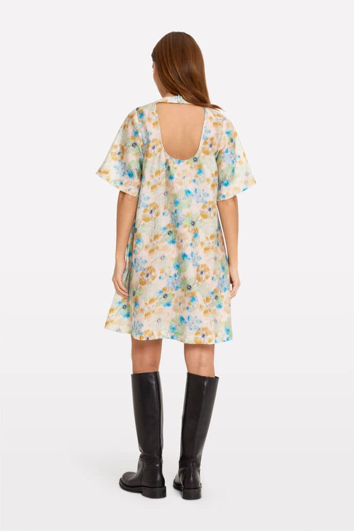 Lyhythihainen Envii mekko kukkakuosilla. Niskassa kiinnitys. A-linjainen hameosa.