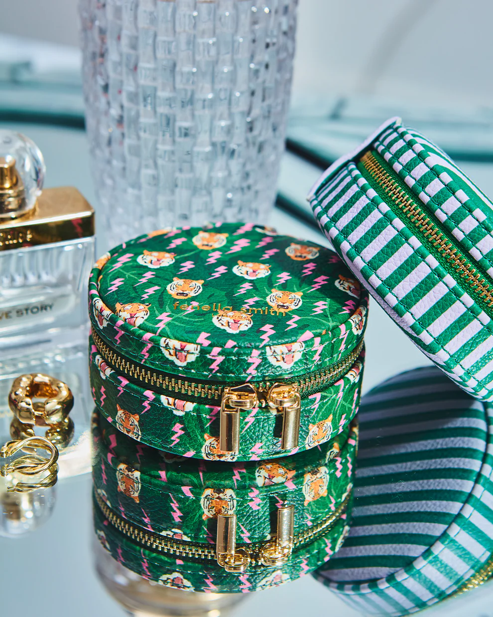 Fenella Smith Round Jewellery Case Green Palm Tiger