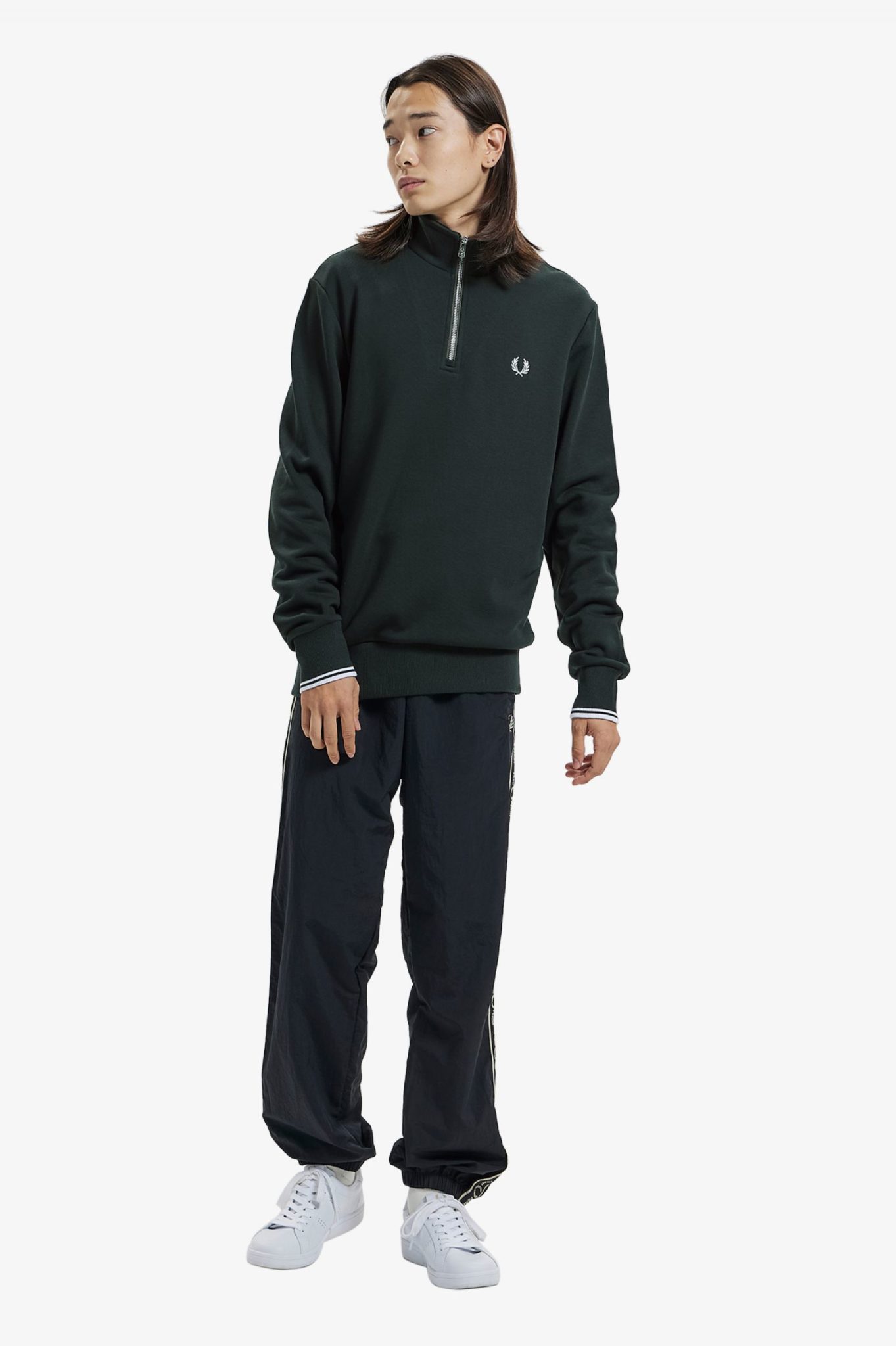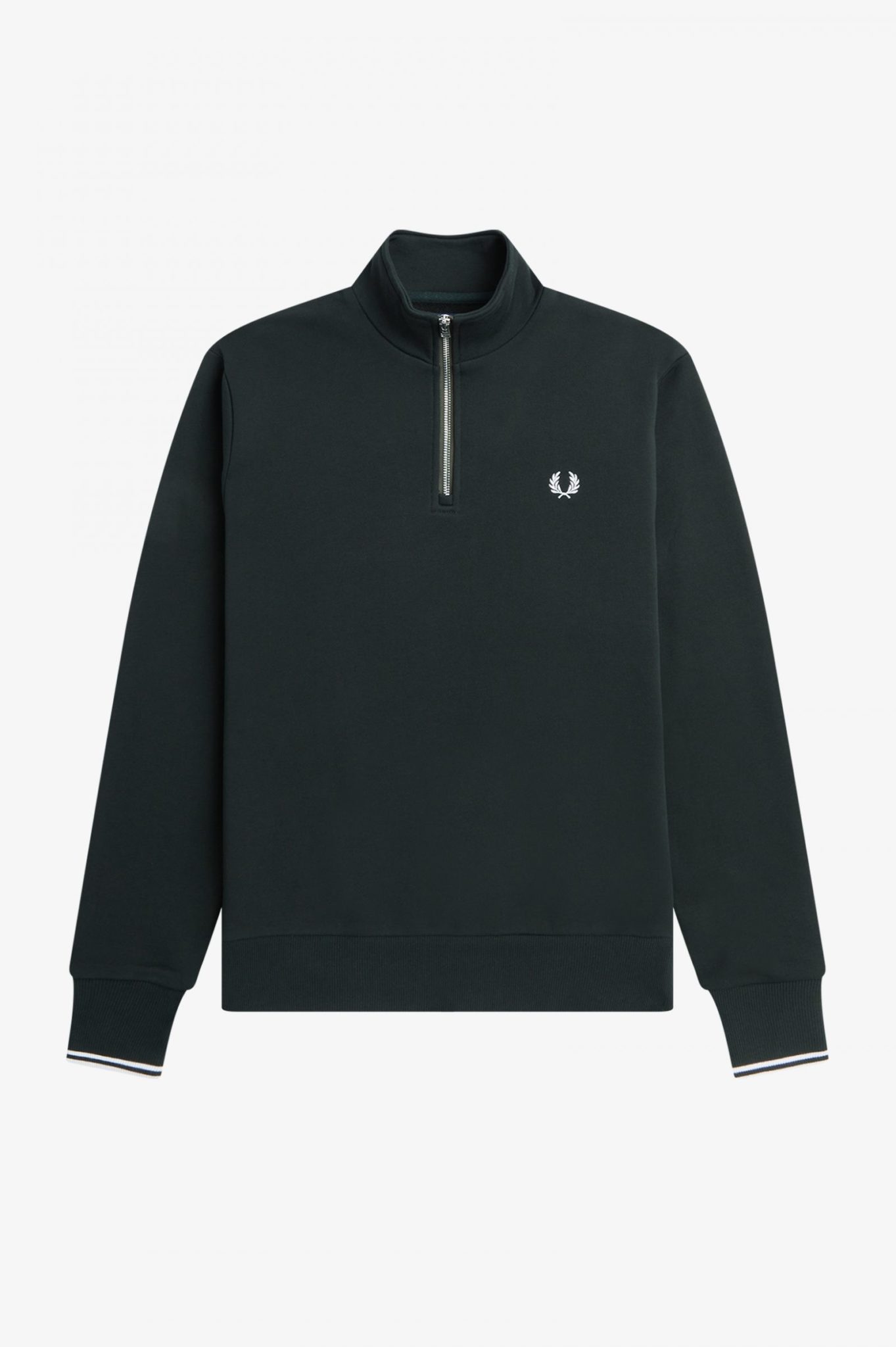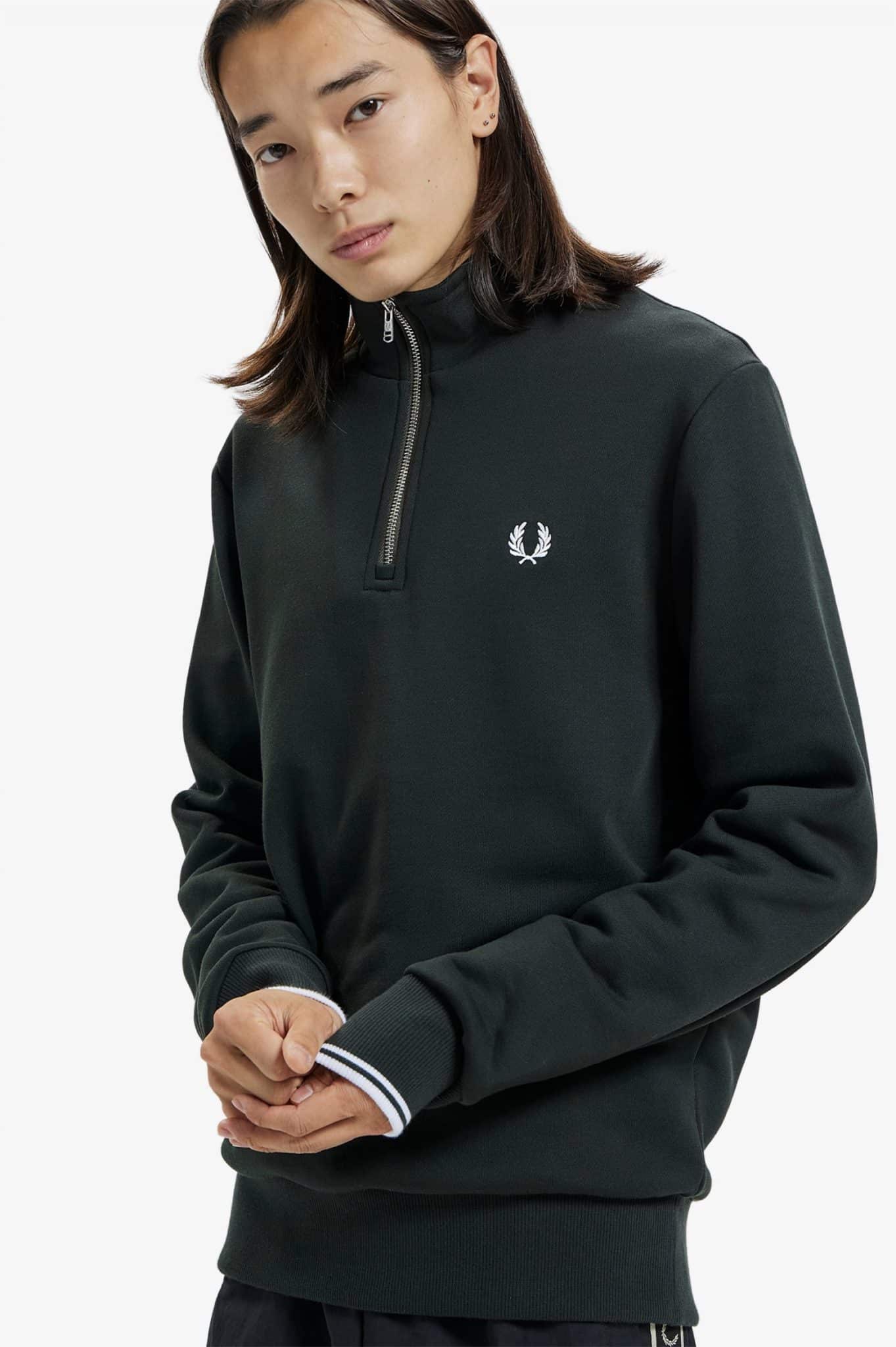 Miesten collegepaita. Minimalistinen Fred Perry half zip -collegepaita. Rinnassa brodeerattu logo. Yksityiskohtana hihansuiden kontrastiraidat.