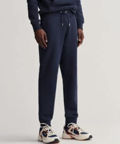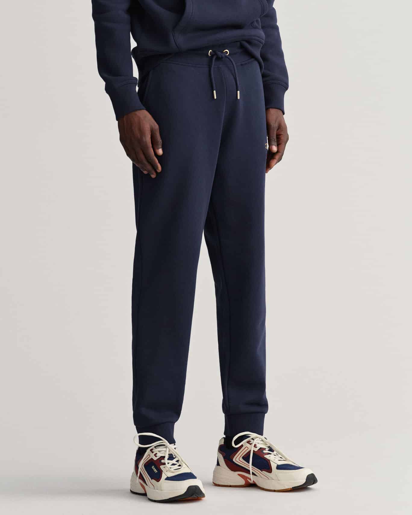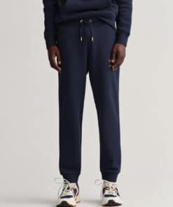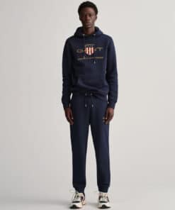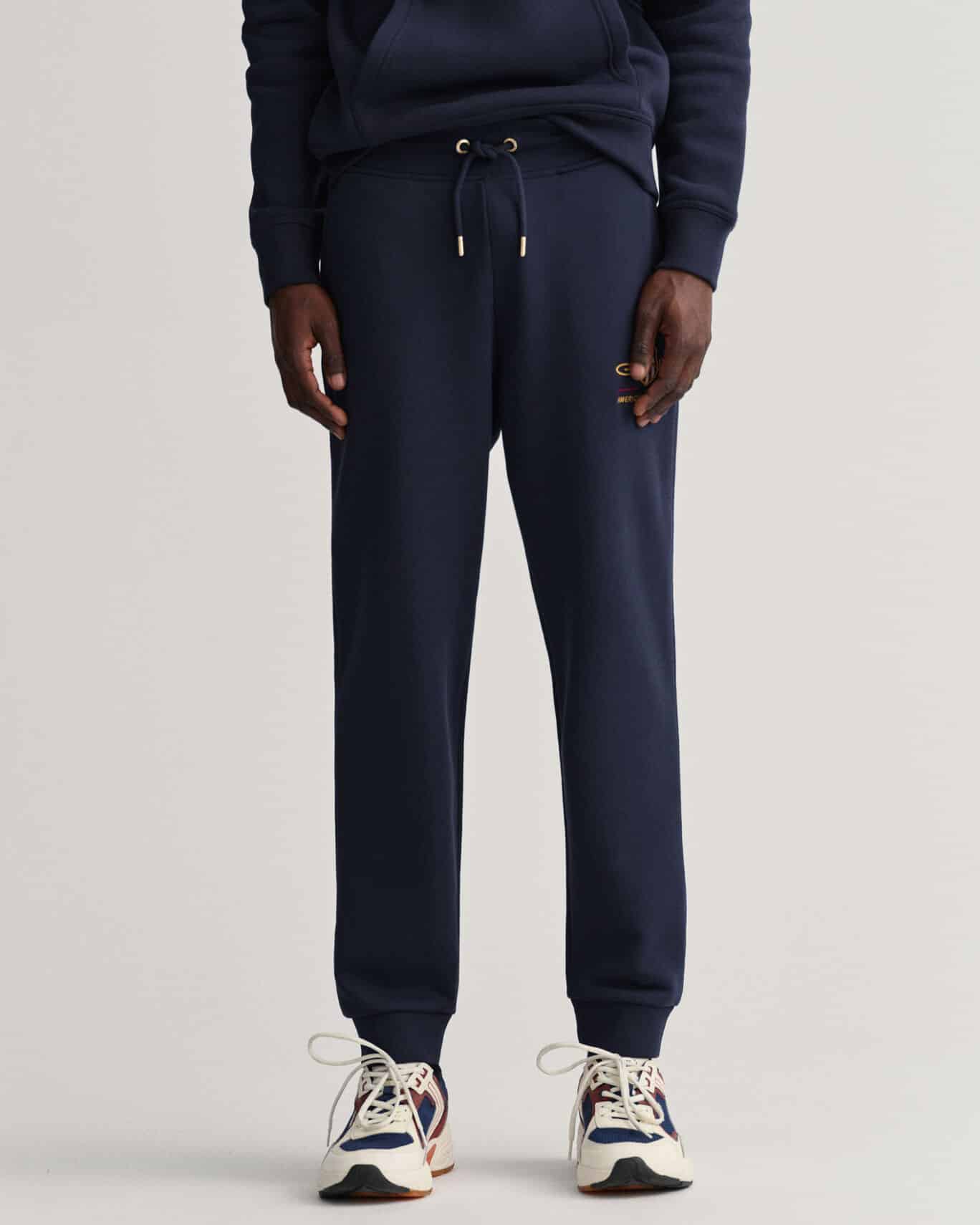 Miesten collegehousut. Collegehousuissa on Gantin 80-luvun mallistosta käyttöön otettu Archive logo. Housuissa on joustava vyötärö, sivutaskut ja ribatut lahkeensuut.