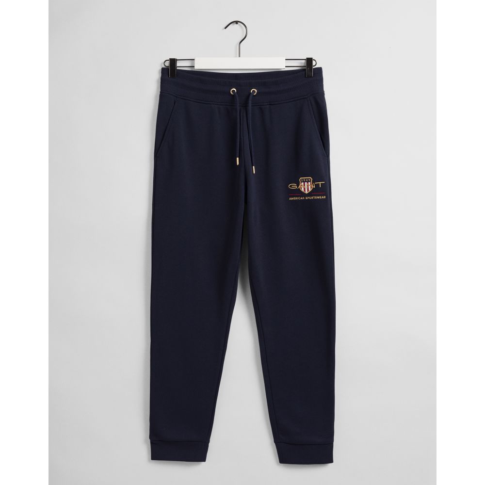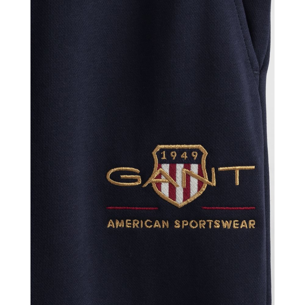 Miesten collegehousut. Collegehousuissa on Gantin 80-luvun mallistosta käyttöön otettu Archive logo. Housuissa on joustava vyötärö, sivutaskut ja ribatut lahkeensuut.