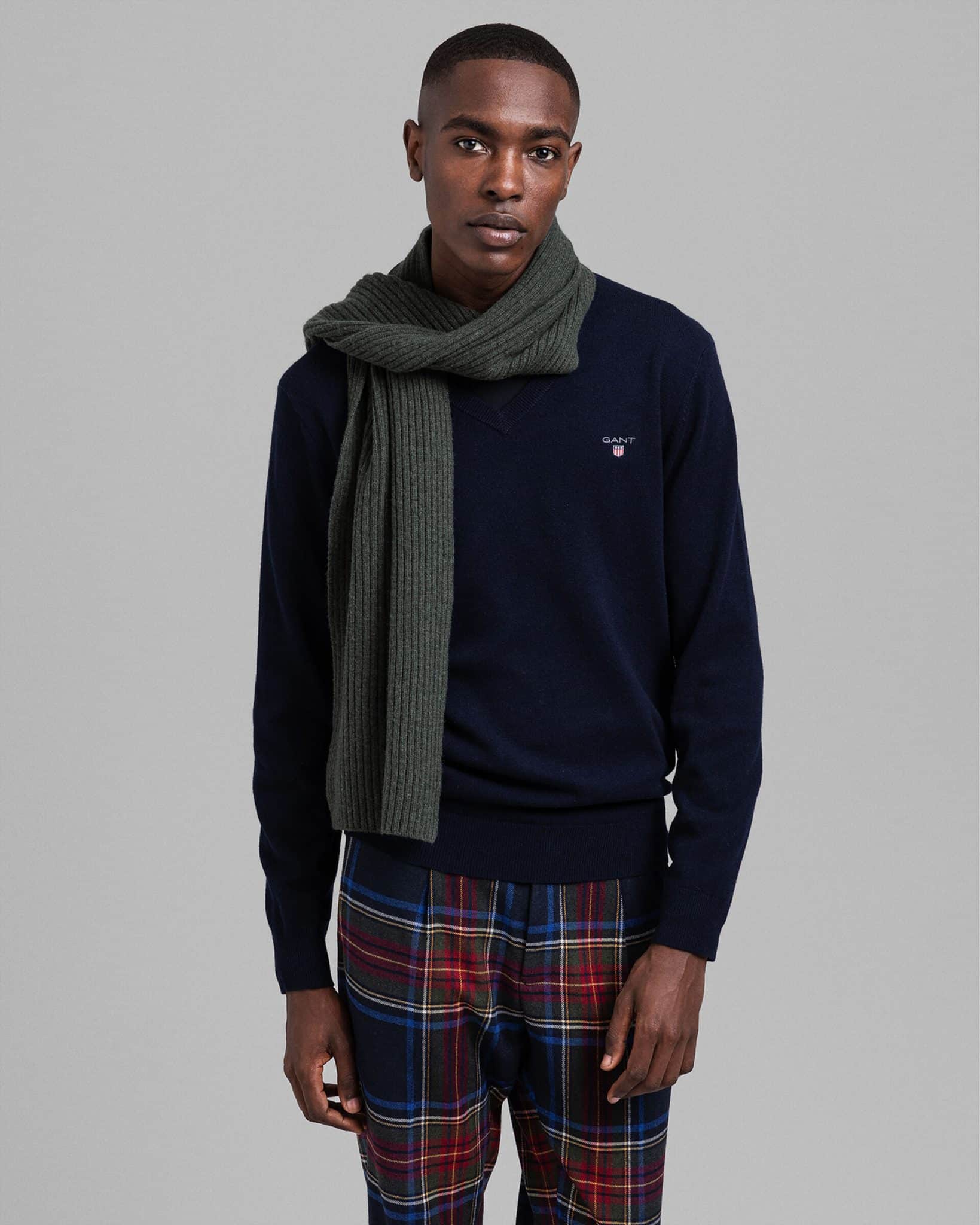 Miesten neule. Erittäin hienosta lampaanvillasta valmistettu Gant neulepusero. Ajattomassa neuleessa on V-pääntie sekä brodeerattu Gant logo rinnassa.