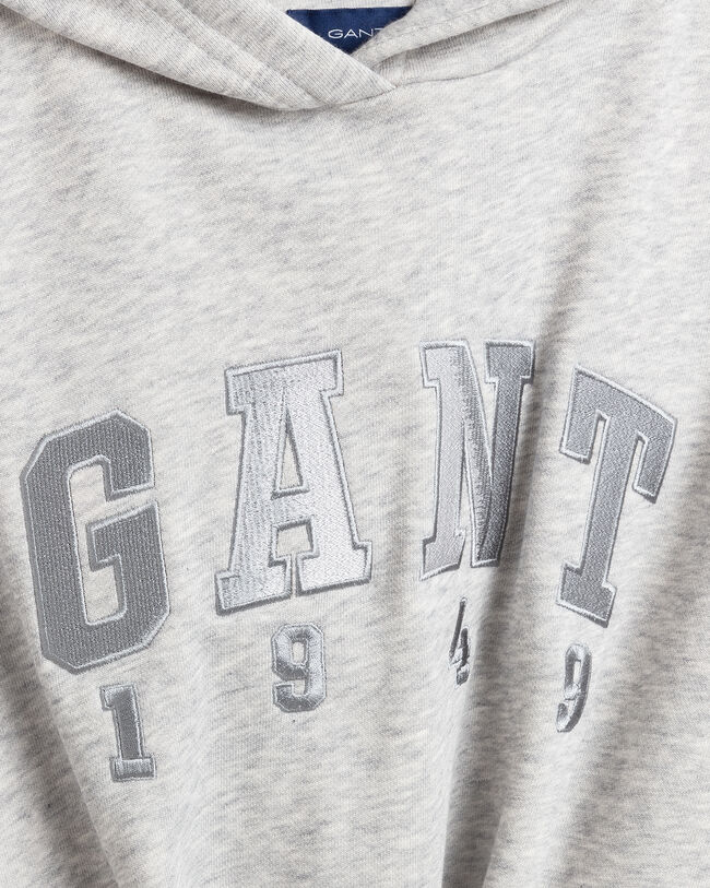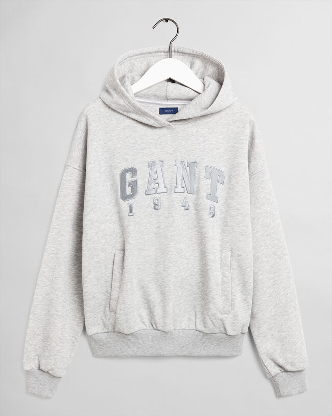 Tyttöjen huppari. Gant Teen Girls malliston harmaa overhead huppari. Hupparissa on kiiltävä Gant logo, kengurutasku sekä rypytyksiä helmassa ha hihansuissa.