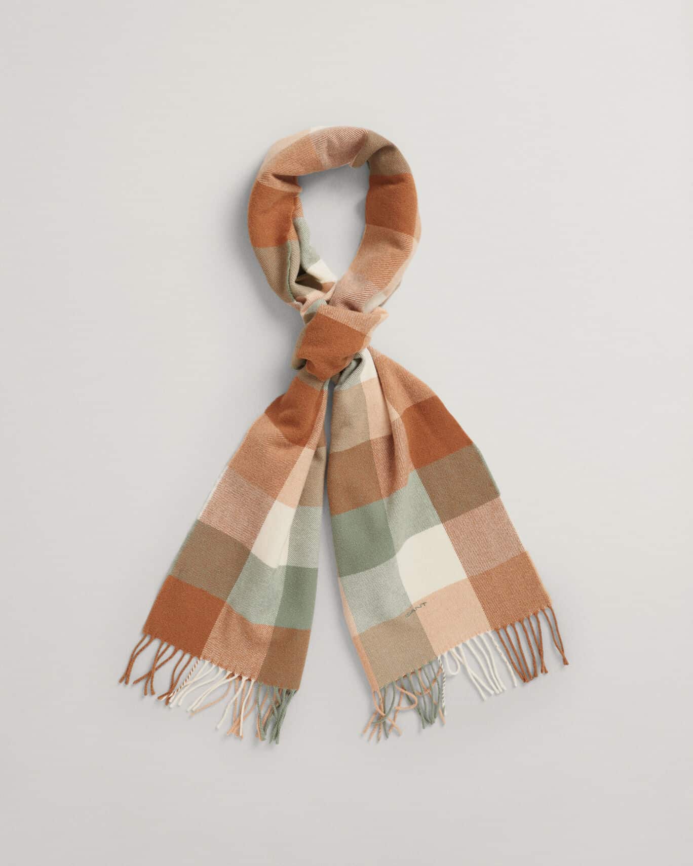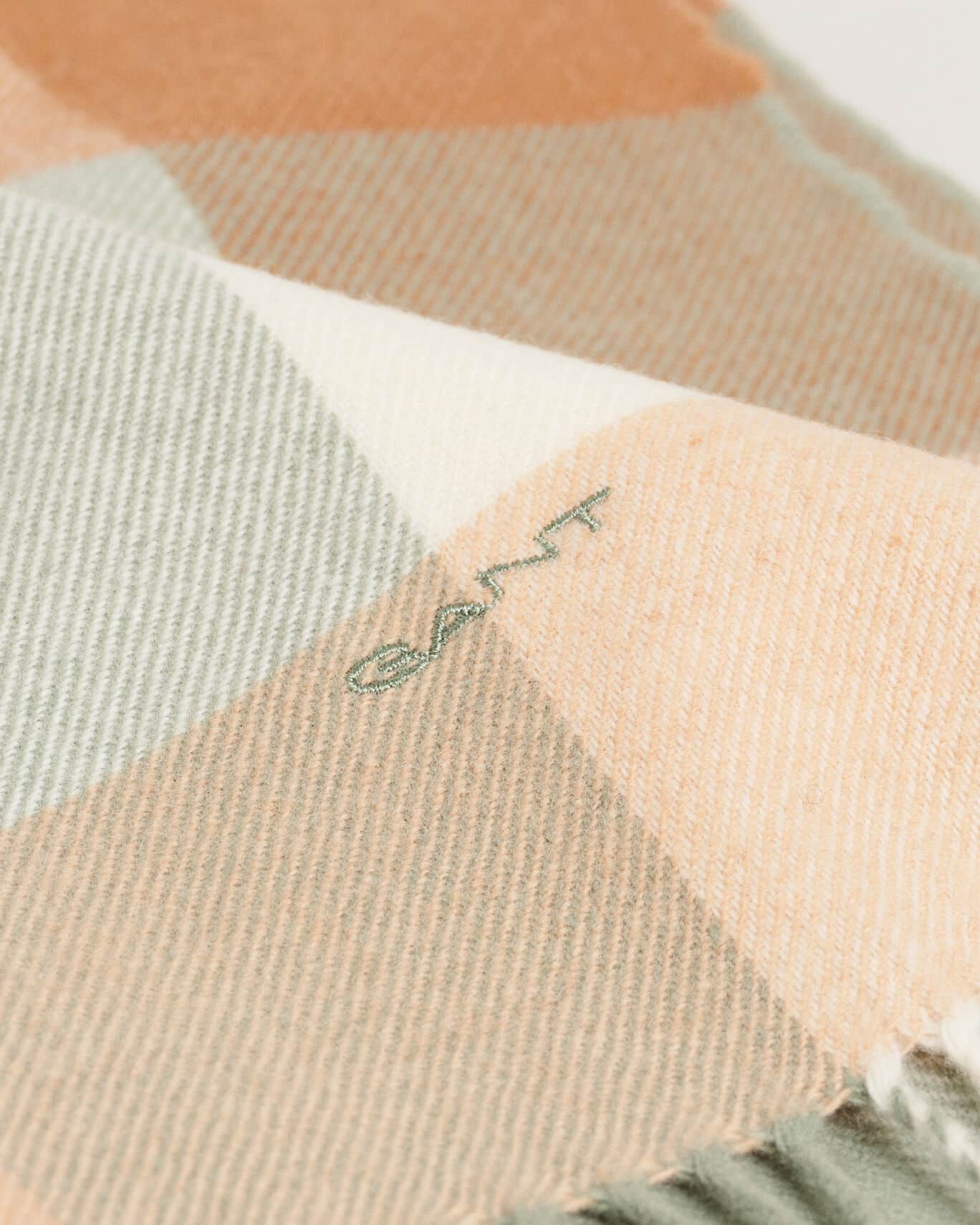Naisten huivi. Ruudullinen Gant Woman villahuivi. Huivin päissä on hapsut. Toisessa päässä brodeerattu Gant logo.