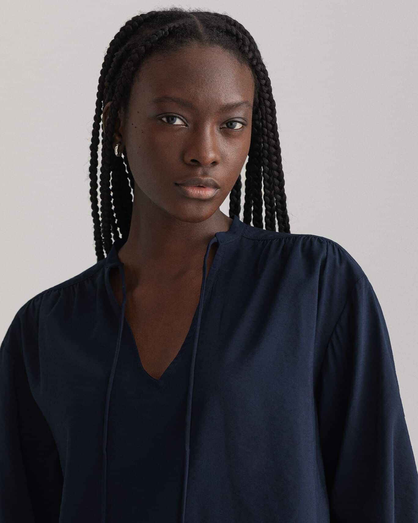 Naisten viskoosipusero. Rento Gant Woman viskoosipusero. Rennossa puserossa on nyöritys kauluksella sekä vajaamittaiset hihat.