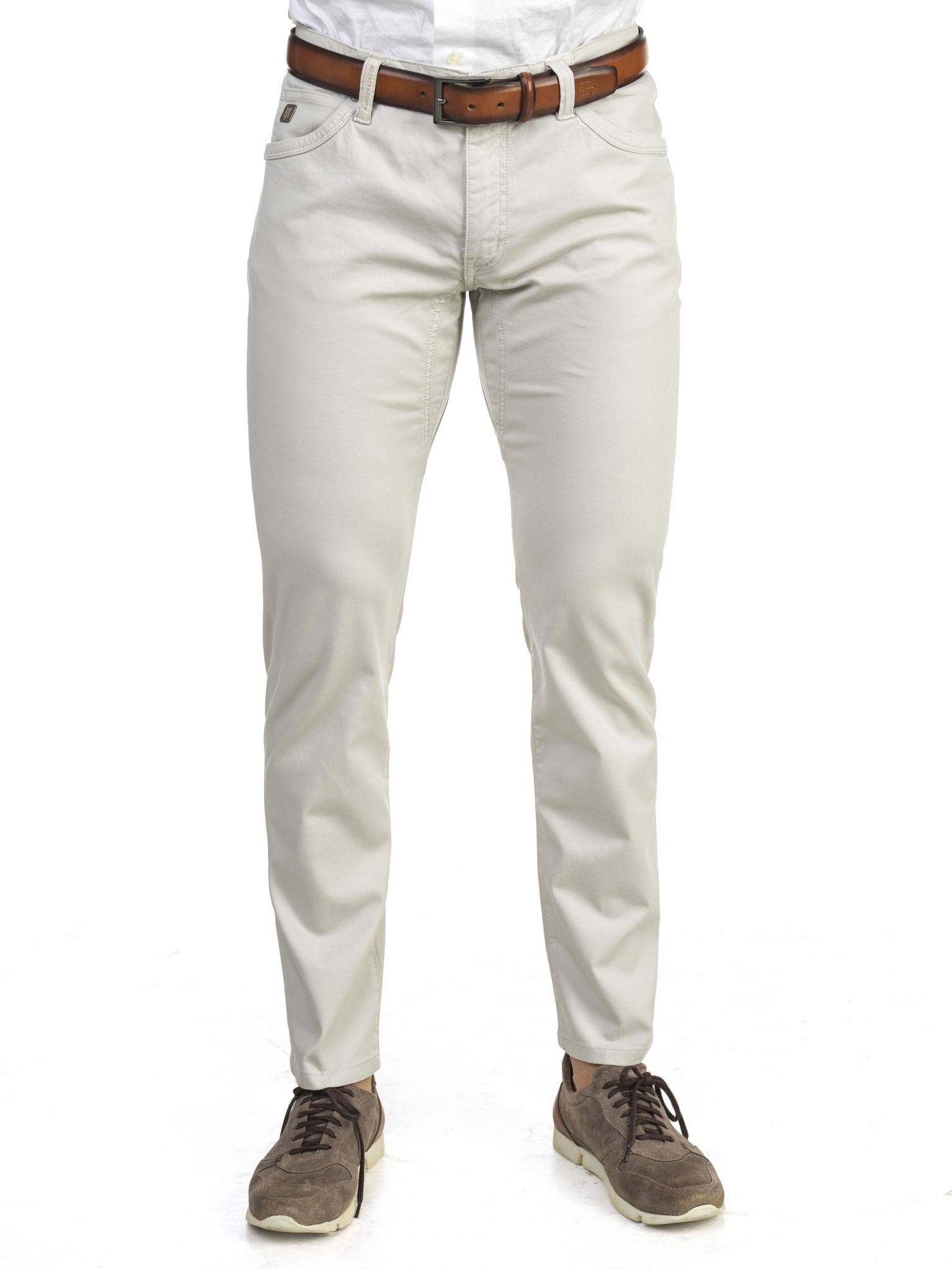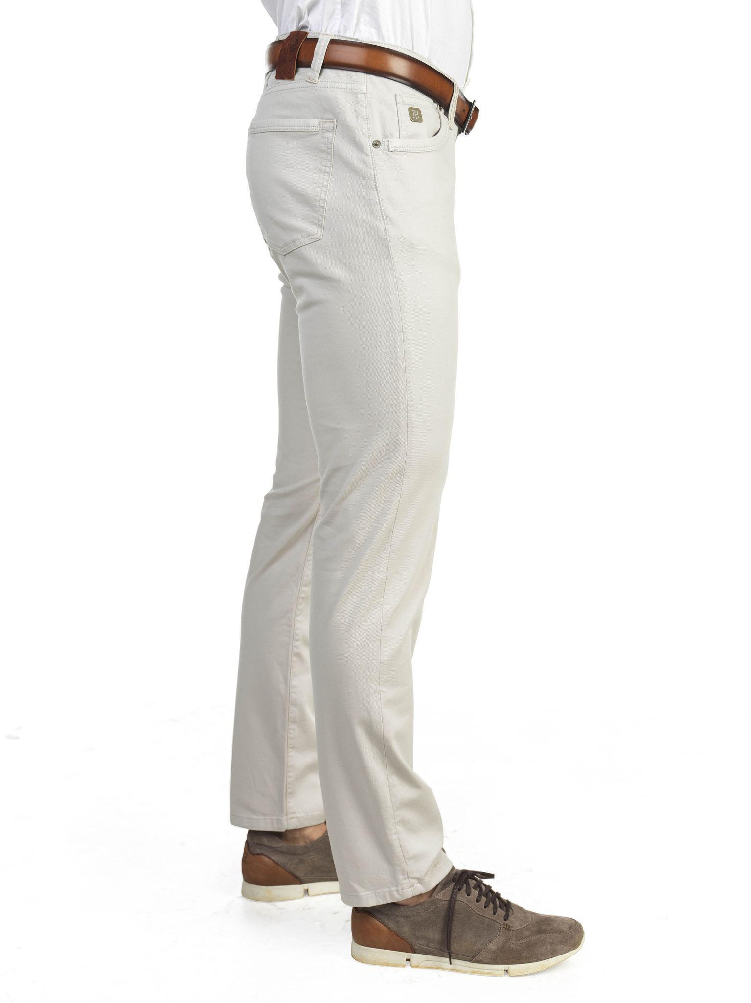 Miesten housut. Suositut Hansen & Jacob viistaskuhousut nyt luonnonvalkoisena. Kapeat housut, YKK-vetoketjukiinnitys.