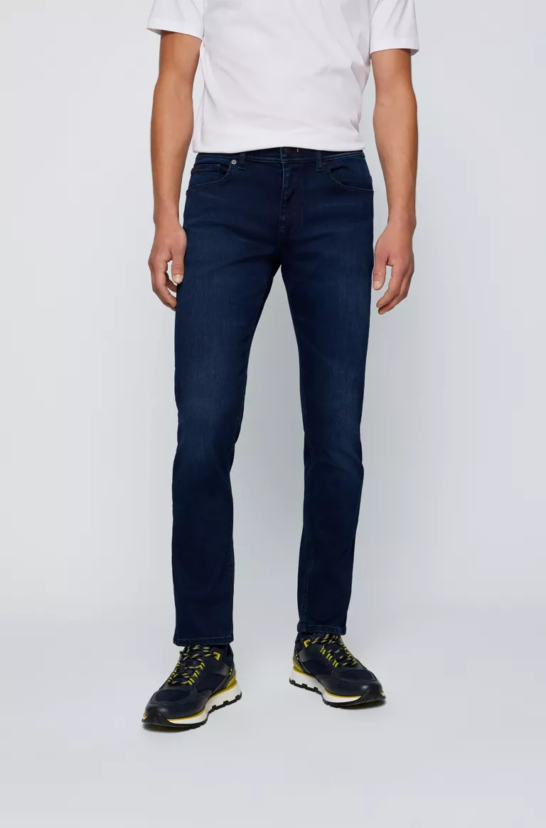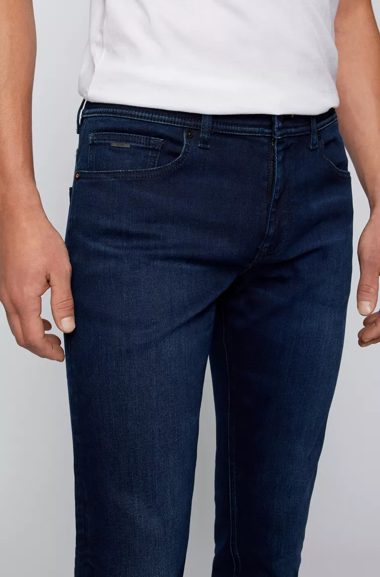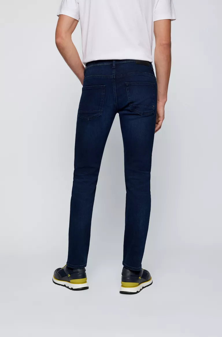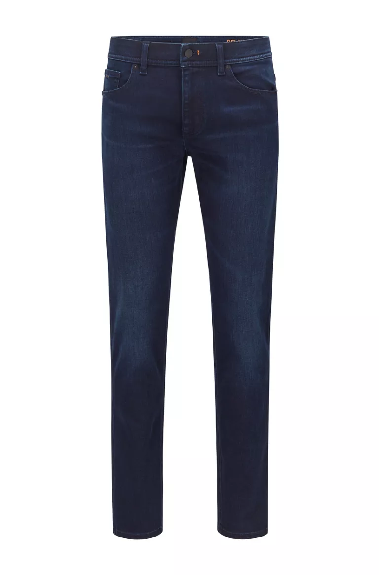 Miesten farkut. Tummansiniset, kapeat Hugo Boss Delaware -viistaskufarkut.