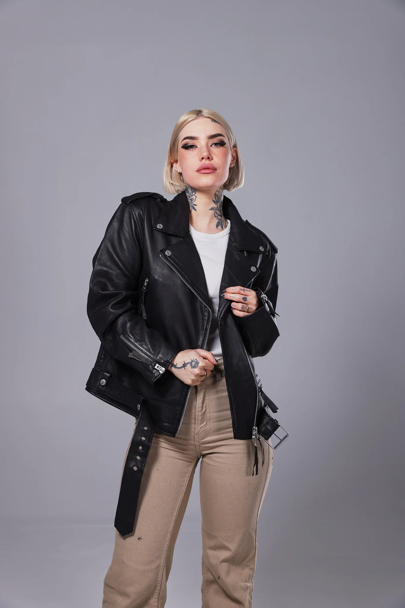 Tyylikkäästi viimeistelty biker-nahkatakki