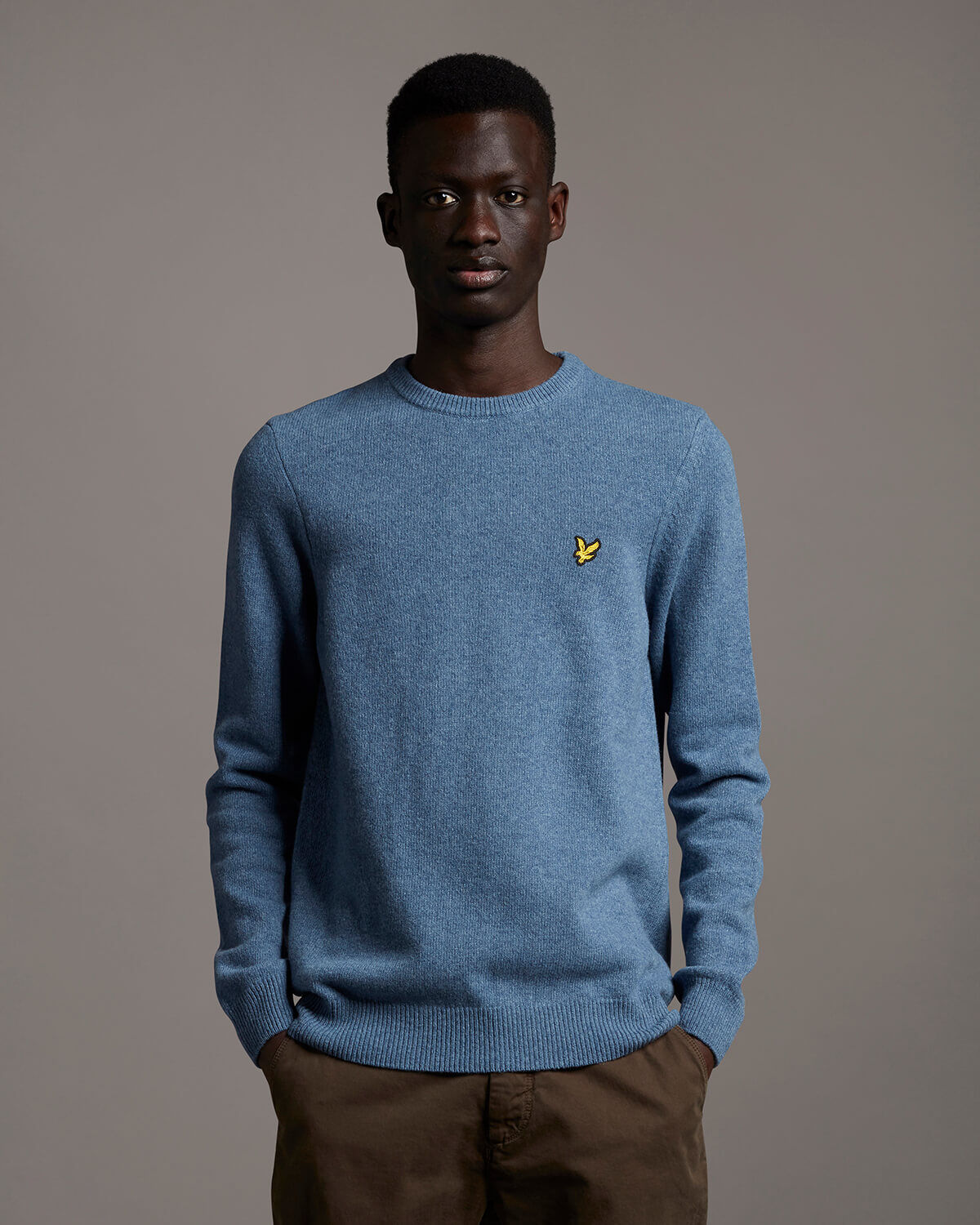 Miesten neule. Ajaton Lyle & Scott villasekoiteneule. Neuleen rinnassa brodeerattu Lyle & Scott Eagle logo. Pyöreä pääntie.