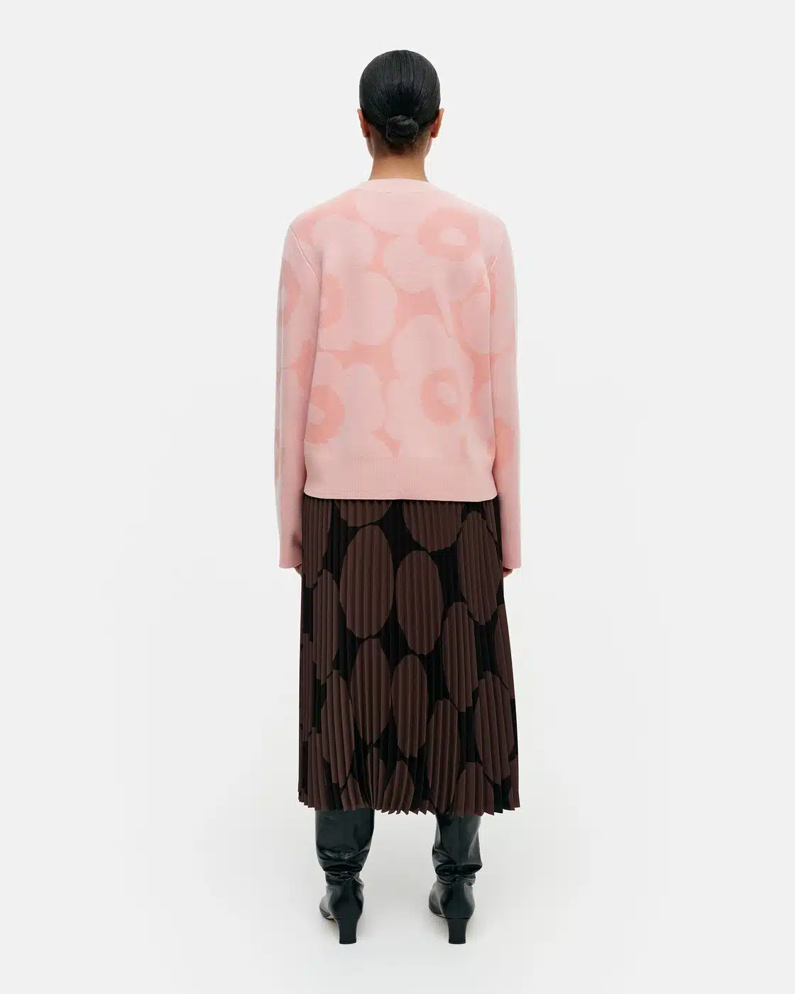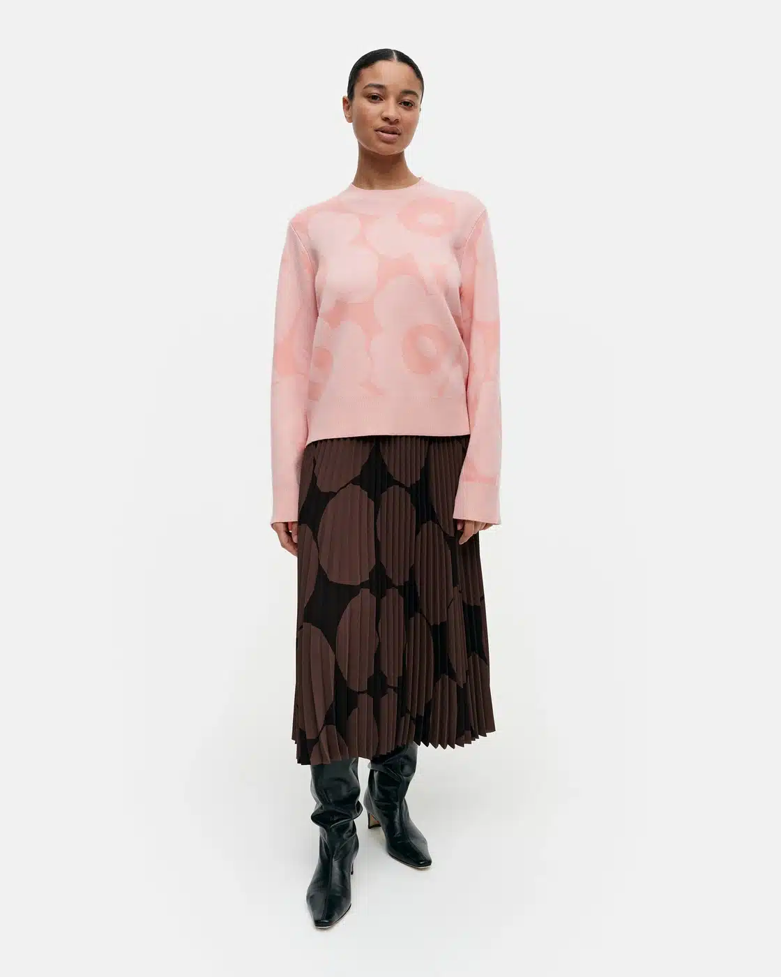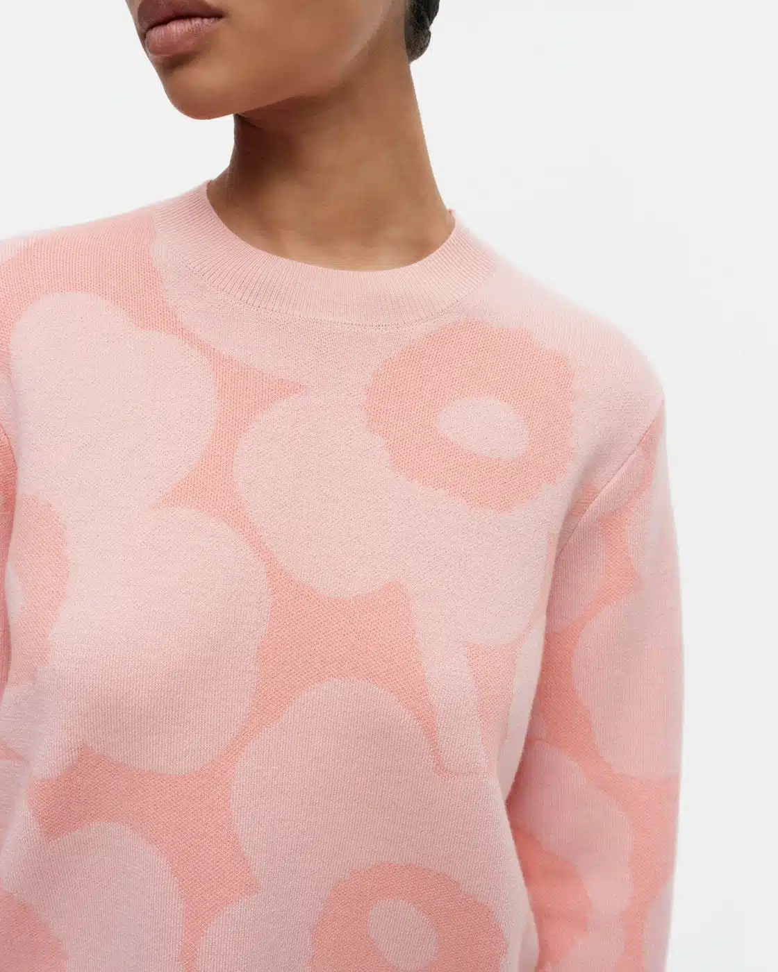 Villa-puuvillasekoitteesta valmistetussa Marimekko Kalotti-neulepuserossa on rento istuvuus ja suora leikkaus. Neulepuserossa on jacquard-kudottu Unikko-kuosi, pyöreä resoripääntie ja leveät resorit hihansuissa sekä helmassa.