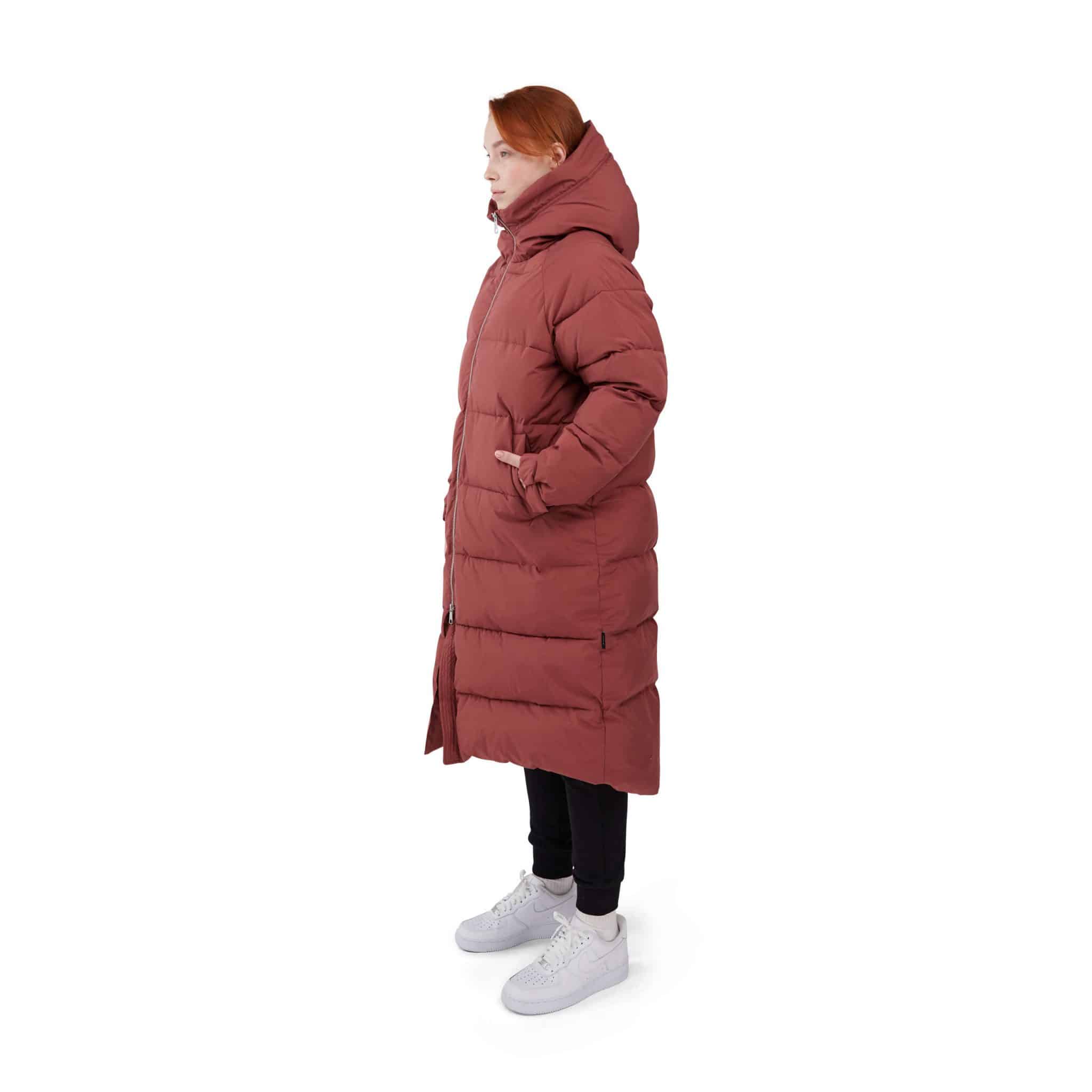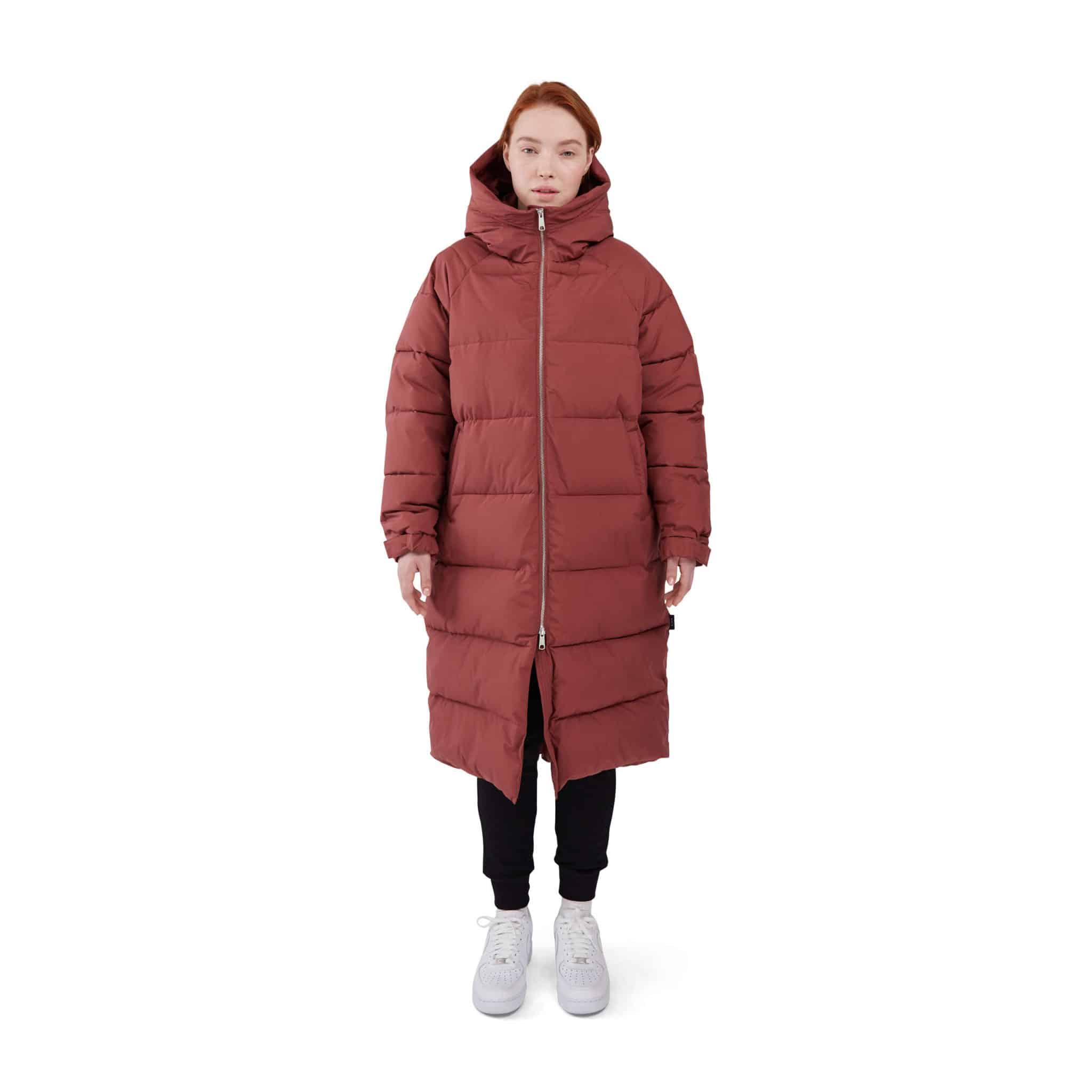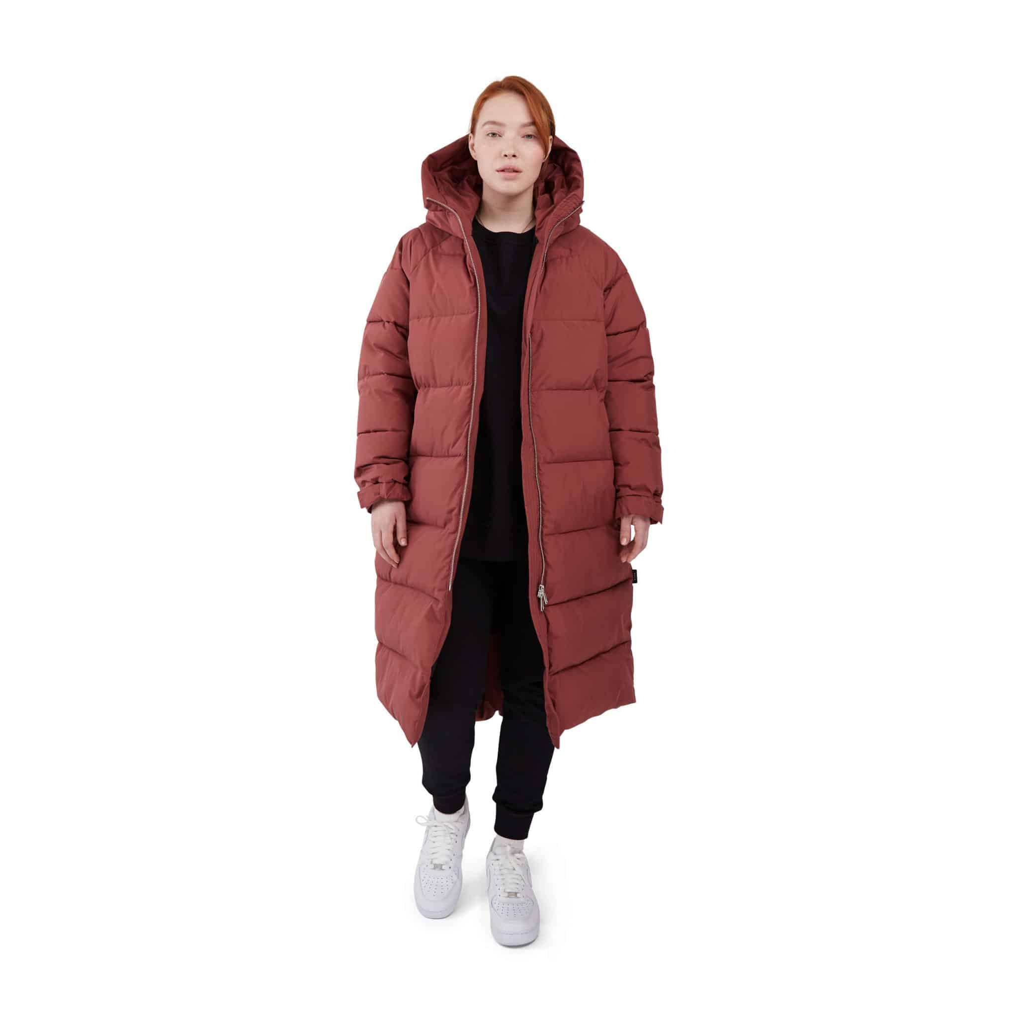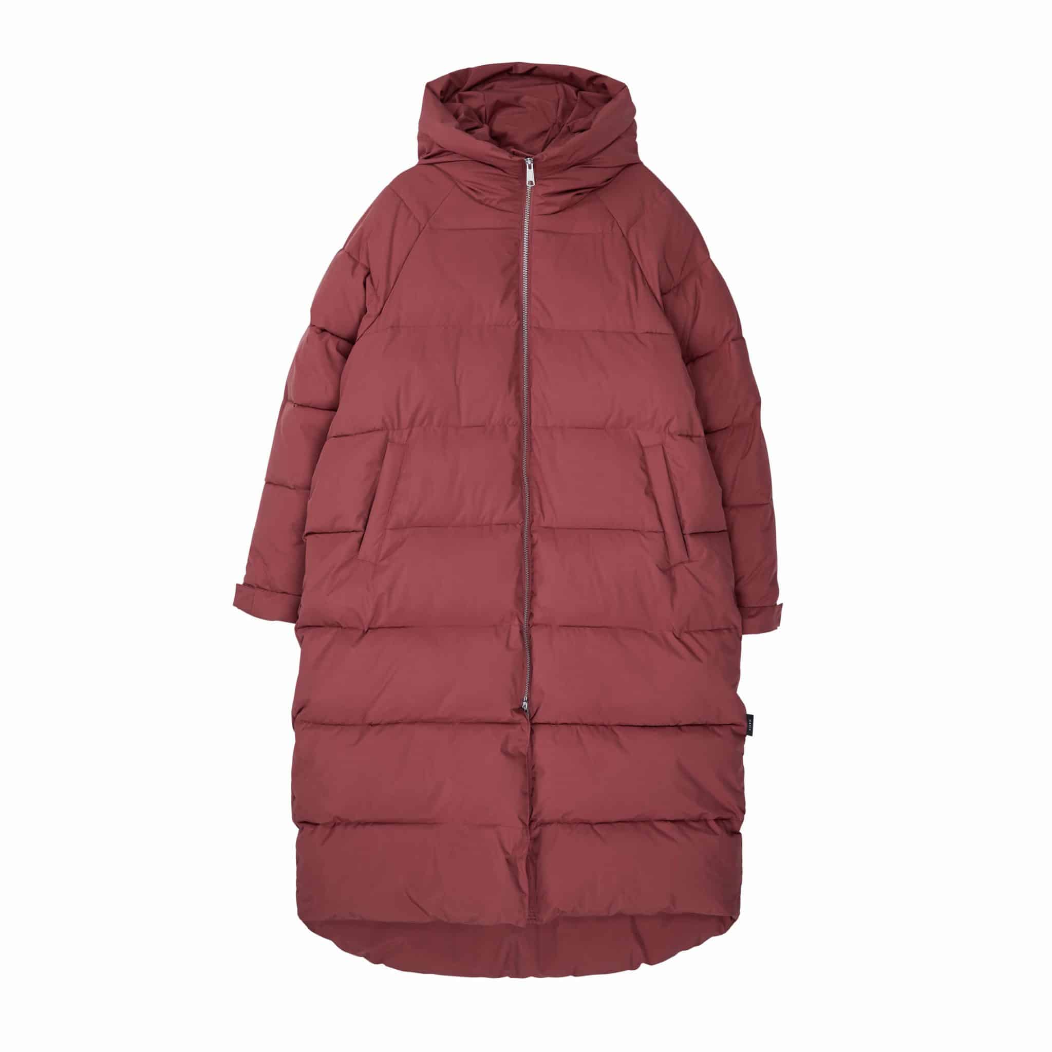 Naisten takki. Muhkea pitkä Makia talvitakki on valmistettu kierrätysmateriaalista. Takki on oversize-mallinen, joten siitä suositellaan otettavaksi kokoa pienempi kuin normaali koko on.