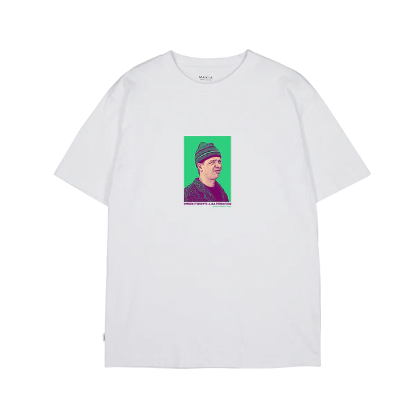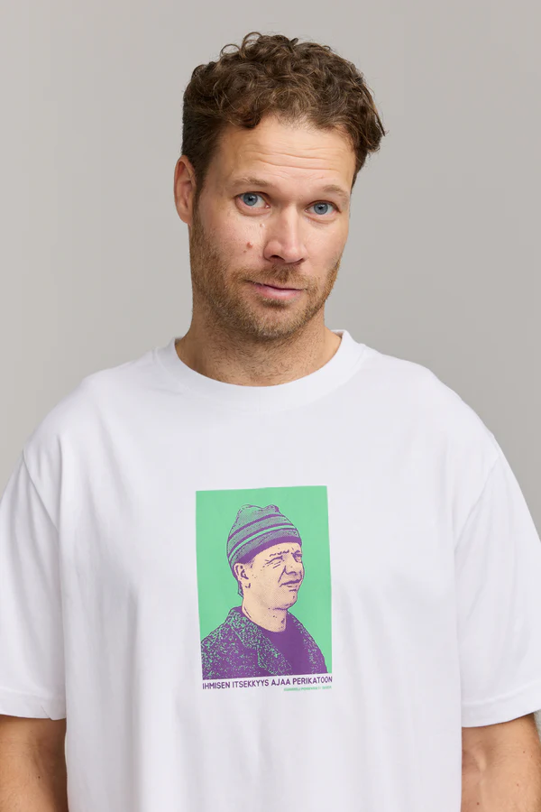 Makia t-paidan printissä ikuistettuna asioiden tilan erikoistuntija Jaakko Parantainen.