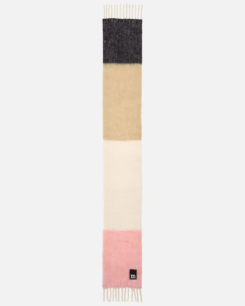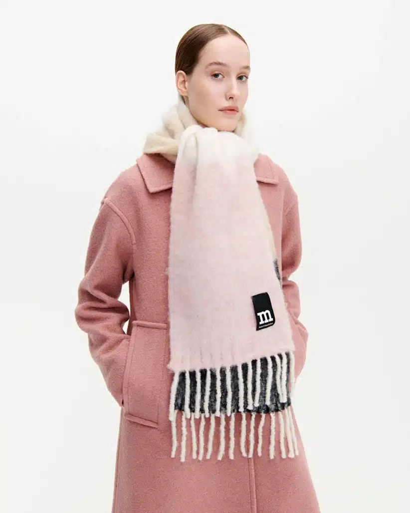Naisten huivi. Marimekko Aamulainen-huivi on valmistettu pehmeän pörröisestä alpakkavillasekoitteesta. Pitkässä huivissa on päätyhapsut.