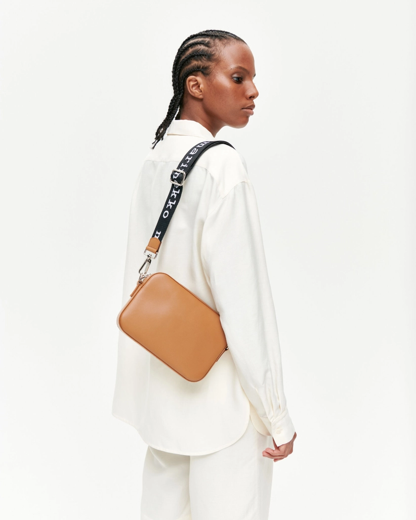 Naisten laukku. Ikoninen Marimekko Gratha -nahkalaukku. Nahkaisessa Marimekko Gratha-olkalaukussa on säädettävä, Marimekko-logoilla varustettu olkahihna sekä vetoketjusuljenta. Laukku on vuoritettu ja sen sisäpuolelta löytyy vetoketjutasku.