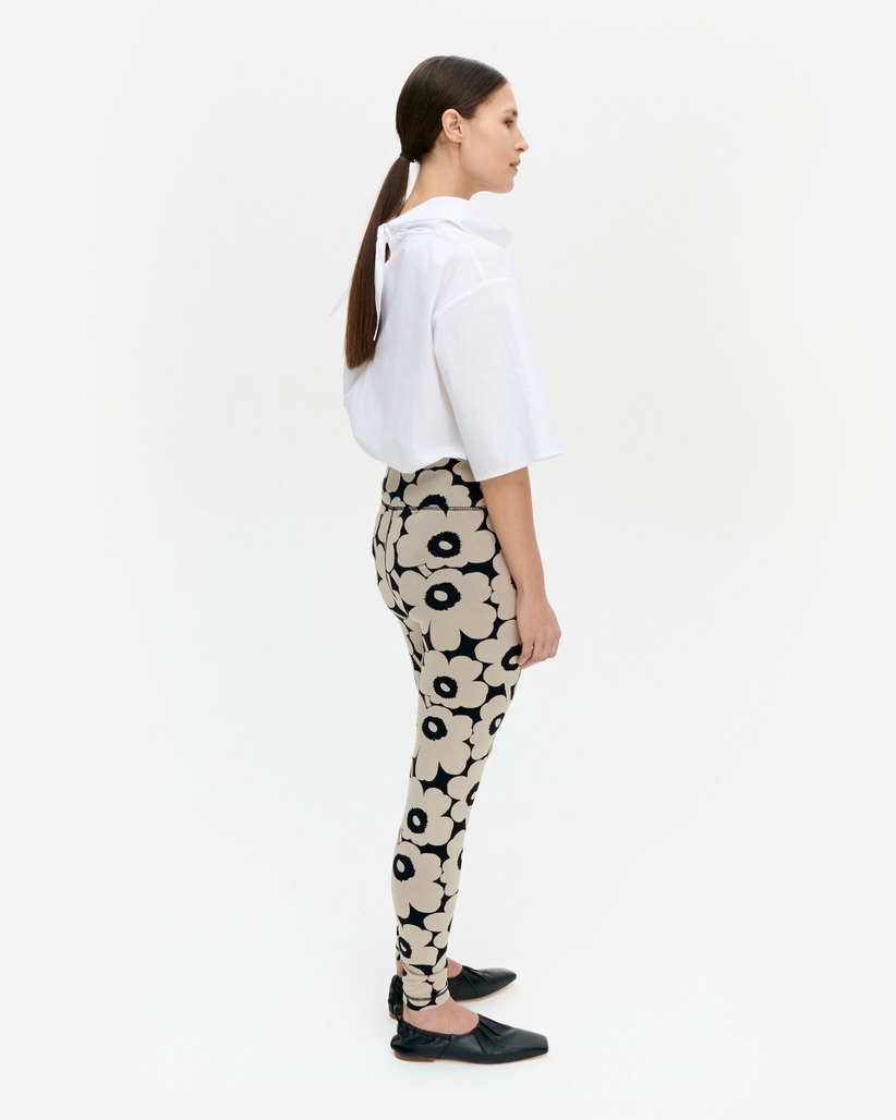 Naisten legginsit. Joustavissa Marimekko Käpälä-leggingseissä on Unikko-kuosi. Housuissa on leveä vyötärökaitale ja vartalonmyötäinen leikkaus.