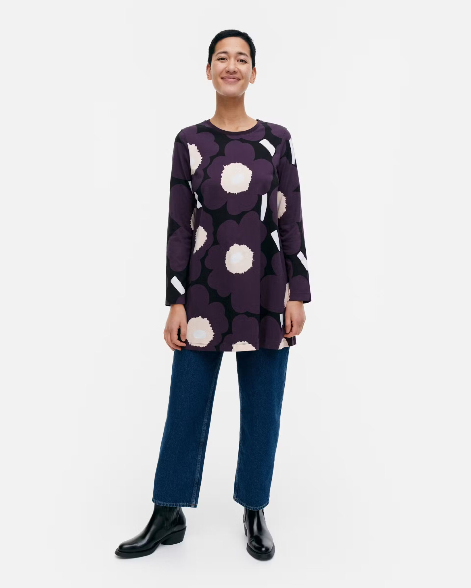 Marimekko Kevät-tunika on valmistettu luomupuuvillatrikoosta ja siinä on niukka istuvuus, A-linjainen leikkaus ja Unikko-kuosi. Tunikassa on omalla kankaalla viimeistelty pyöreä pääntie ja pitkät hihat.