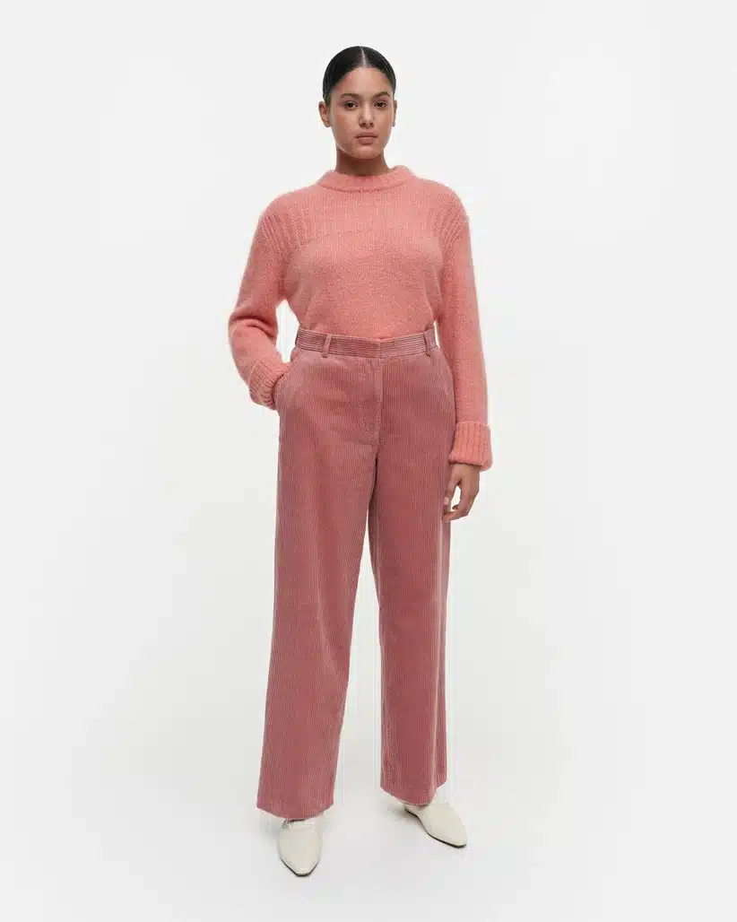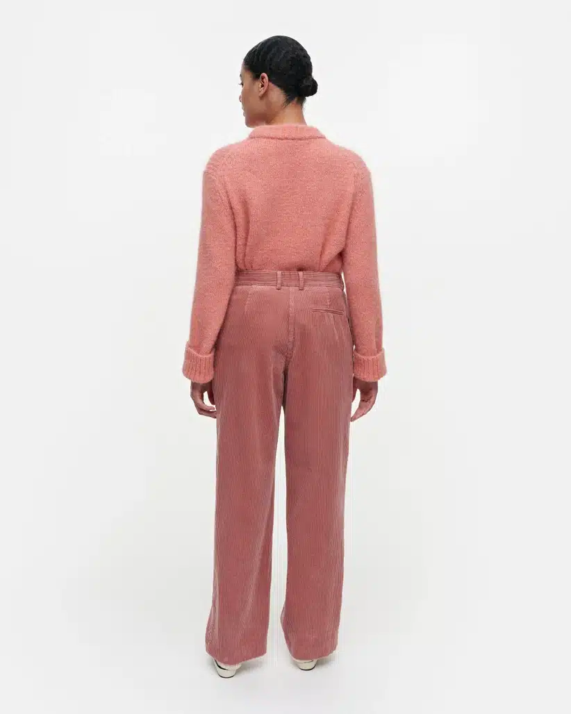 Naisten amettihousut. Ihastuttavat Marimekko samettihousut luomupuuvillaa. Housuissa on edessä nappi sekä hakanen ja vetoketjusuljenta. Housuissa on viistot sivutaskut, takana on valelistatasku ja vyötärökaitaleessa on vyölenkit. Lahkeet ovat suorat.