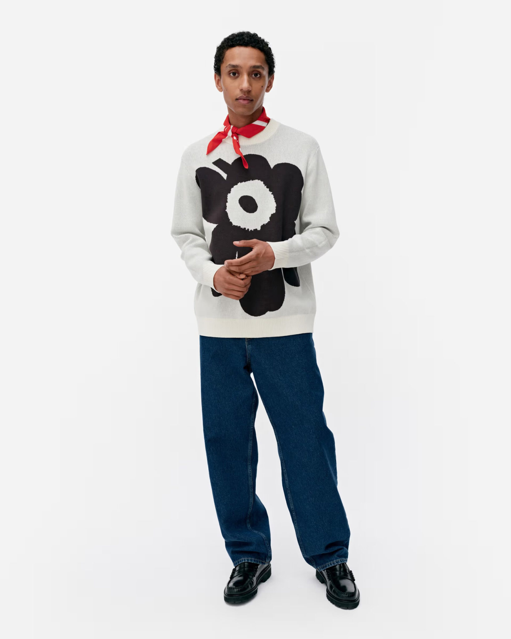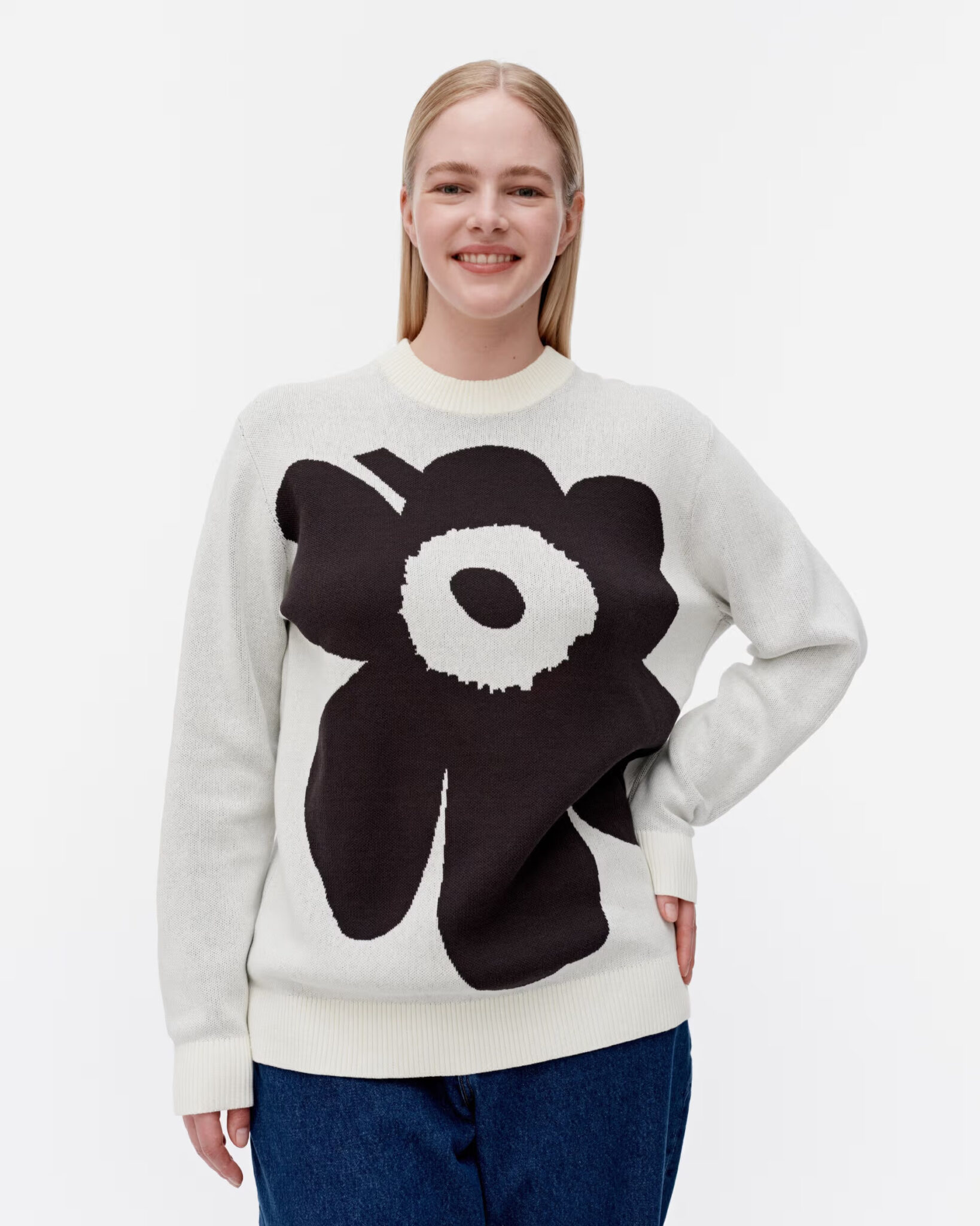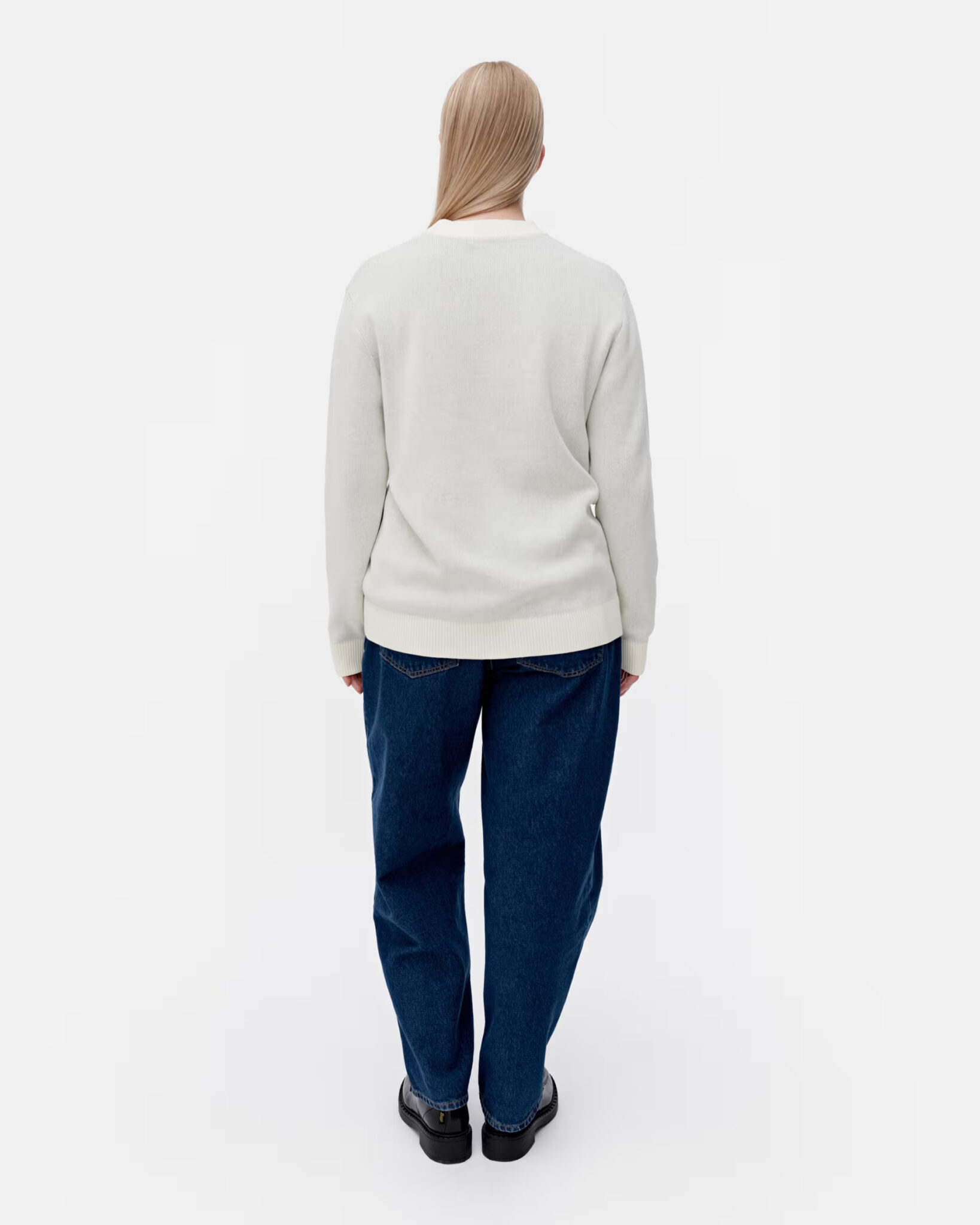 Marimekko Lasi-neulepaita on valmistettu luomupuuvillasta ja siinä on rento istuvuus sekä unisex-mitoitus.
