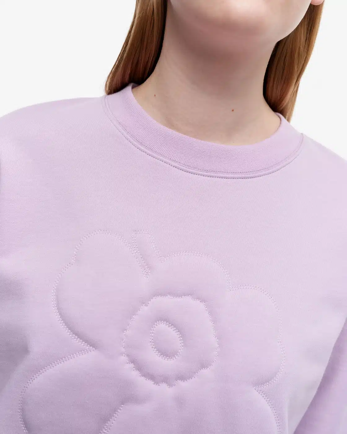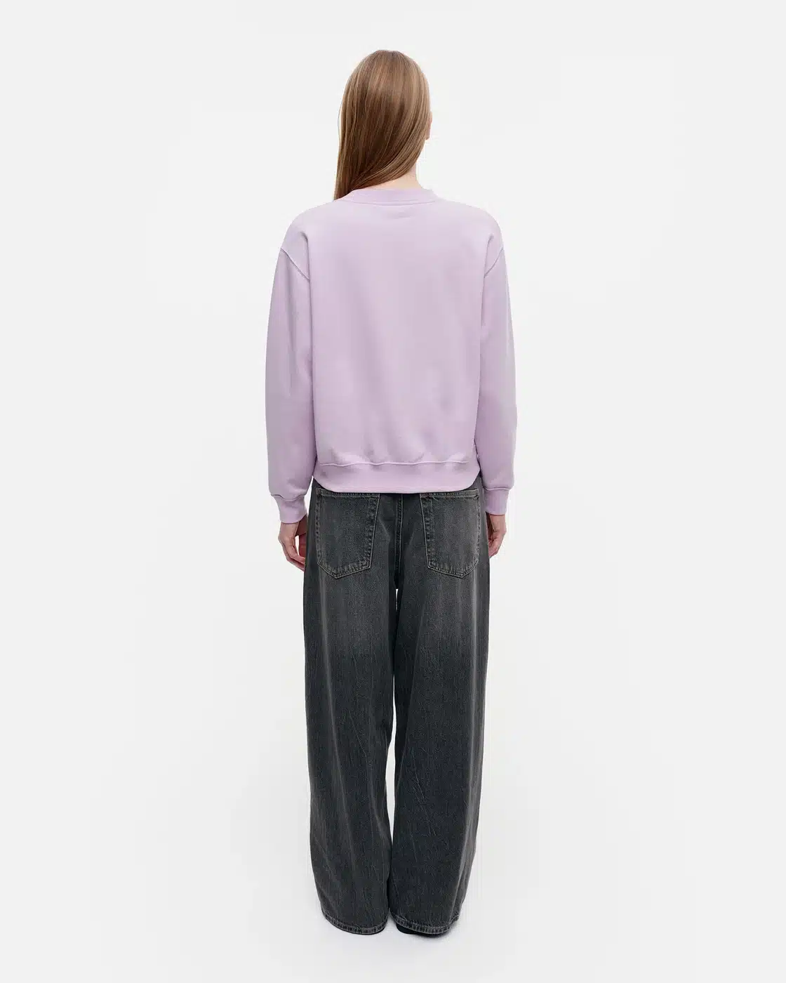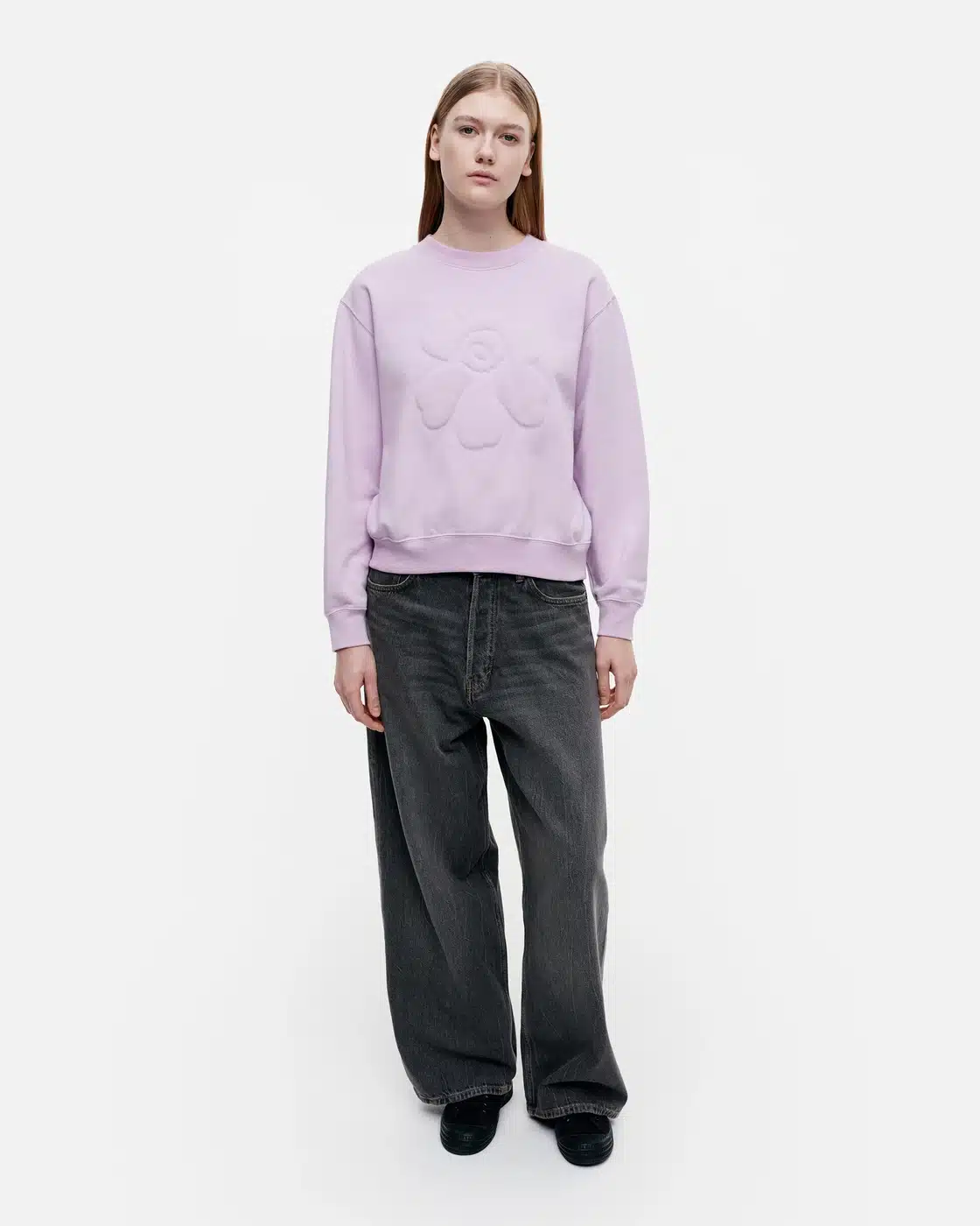 Marimekko collegessa on brodeerattu suuri, pehmustettu Unikko-kuosin kukka etupuolella.
