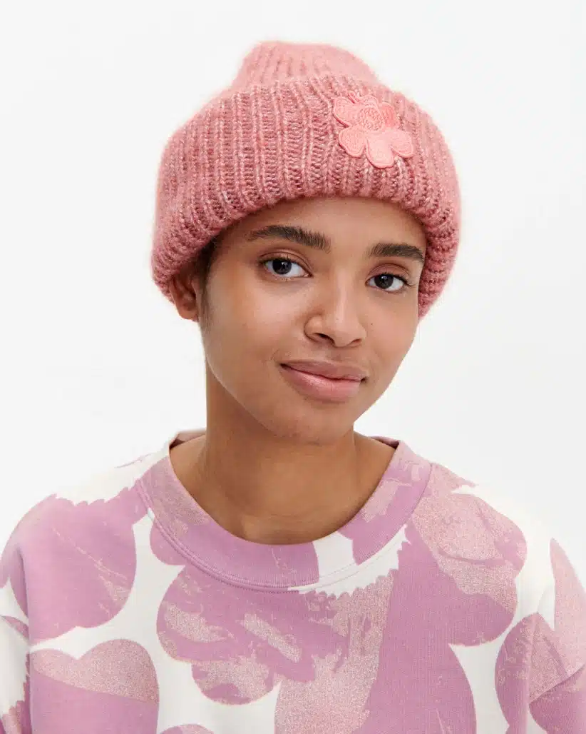 Marimekko pipo. Marimekko Ludia-pipo on neulottu pehmeän pörröisestä alpakkavillasekoitteesta, jossa on mukana kimallelankaa. Pipossa on leveä käänne ja brodeerattu Unikko-kuosin kukka etupuolella.