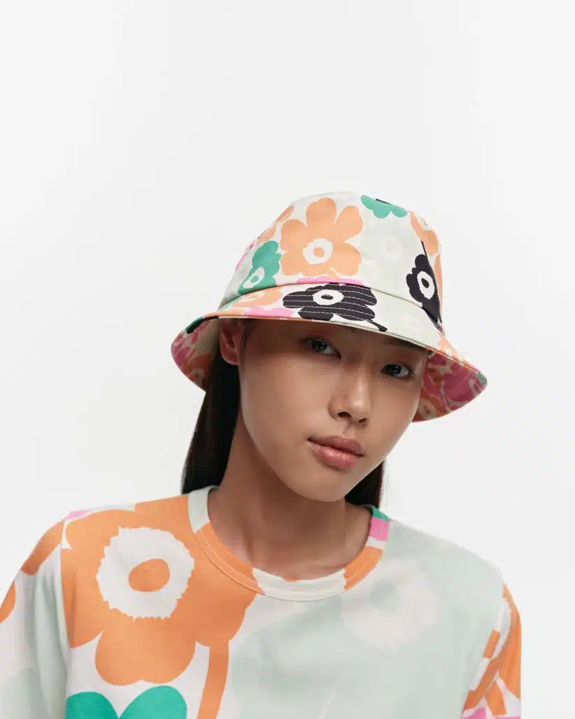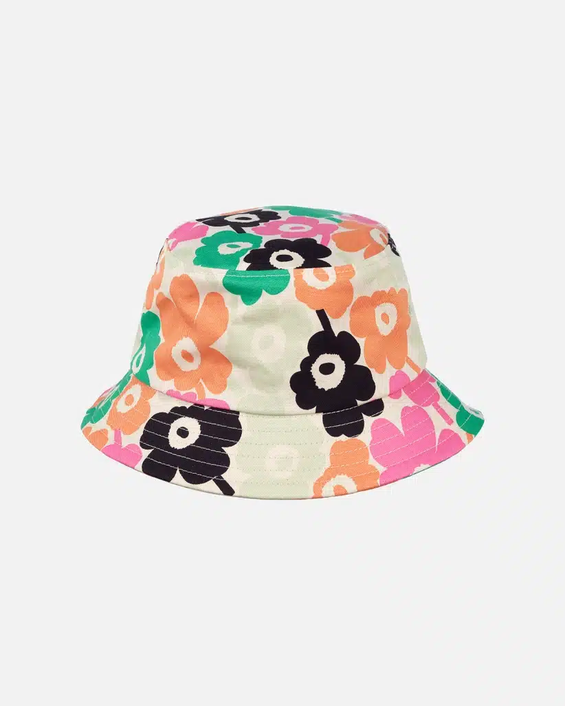 Marimekko hattu. Marimekko Mäkikaura-hattu on valmistettu valkaisemattomasta puuvillasta, jossa on monivärinen Unikko-kuosi.