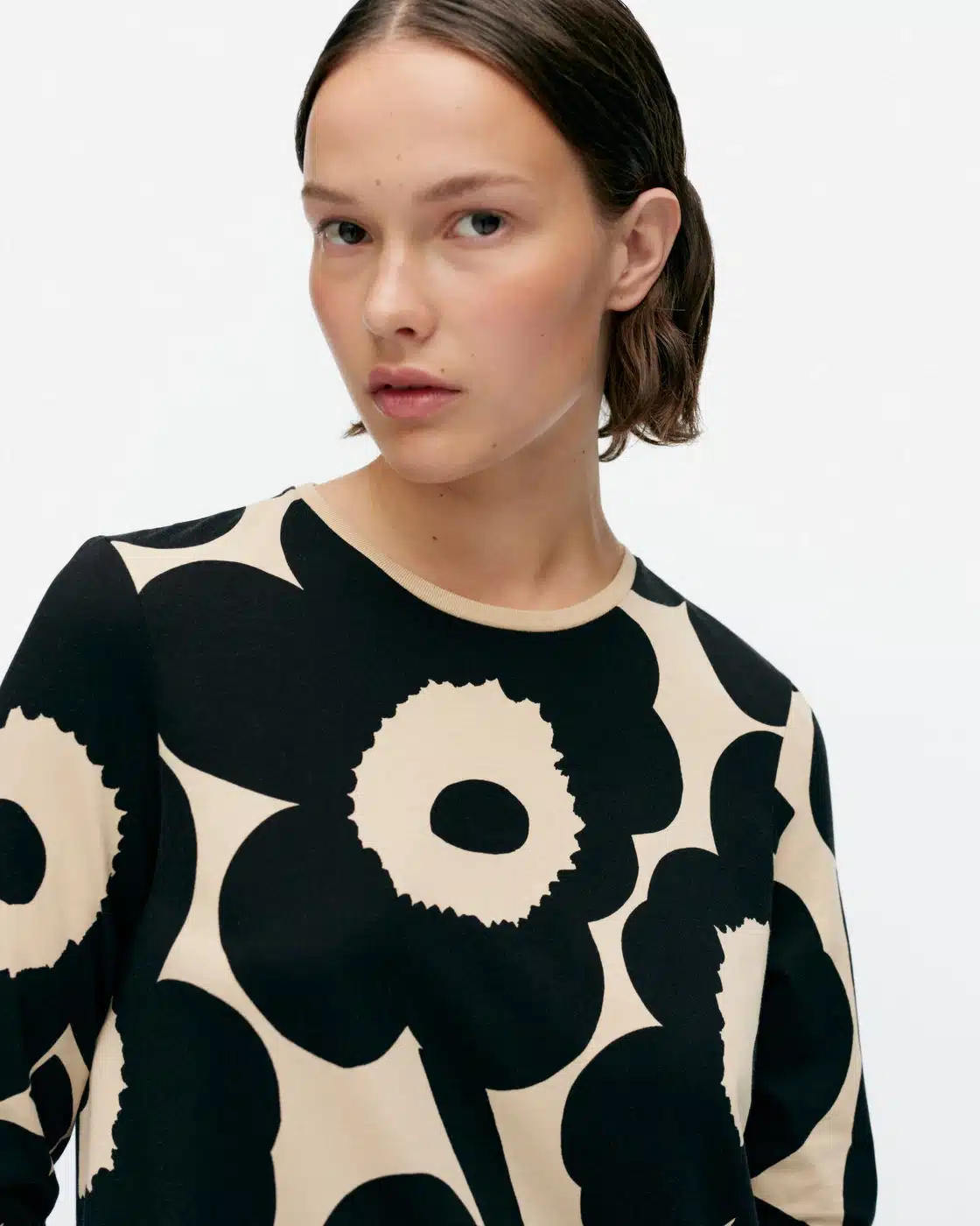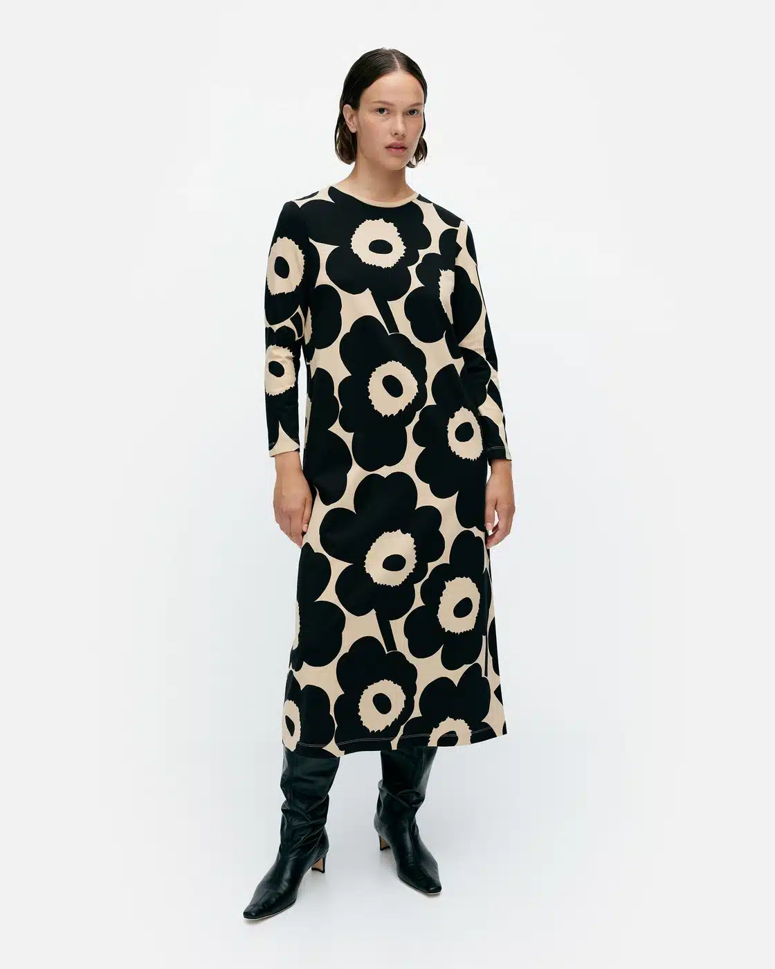 Marimekko Maksiimi-puuvillatrikoomekossa on niukka istuvuus ja A-linjainen leikkaus sekä Unikko-kuosi. Mekossa on pyöreä pääntie.