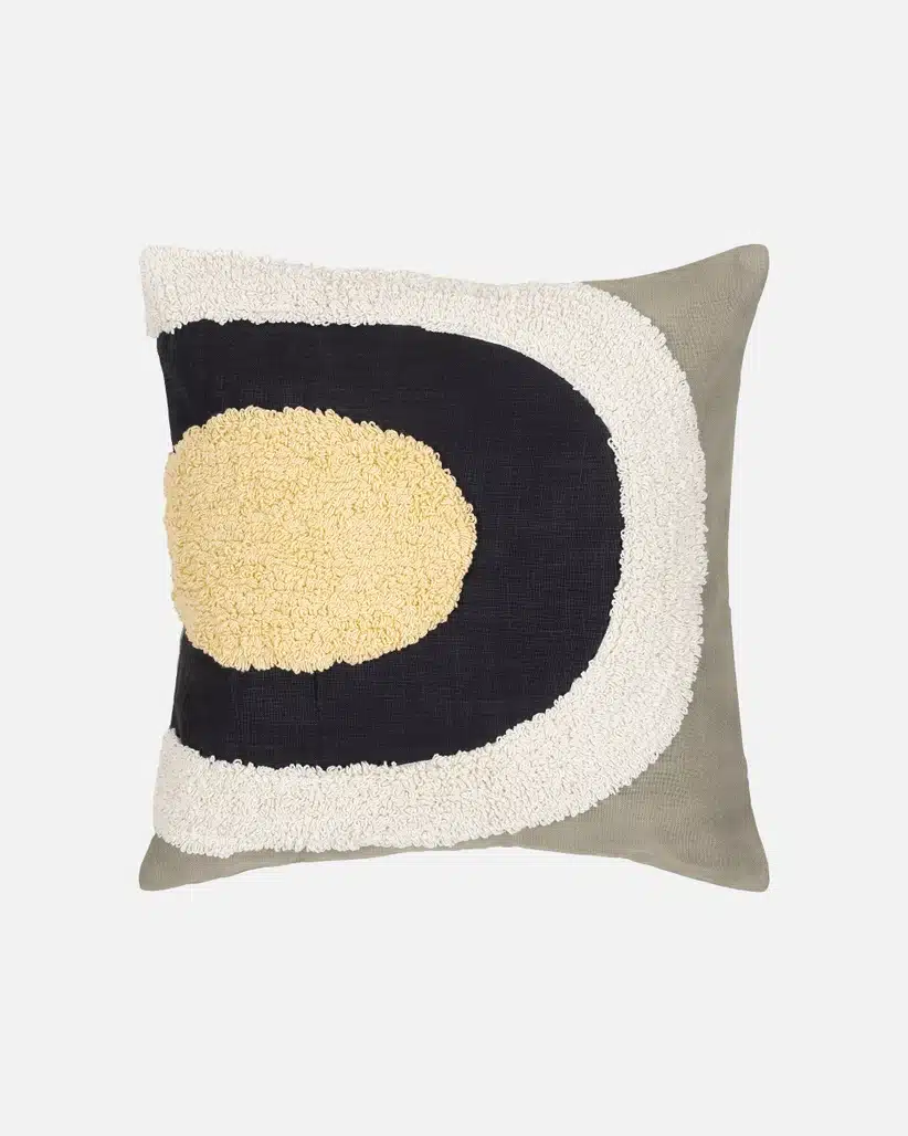 Marimekko tyynynpäällinen. Puuvillapellavasta valmistetussa Marimekko tyynynpäällisessä on osittain brodeerattu Melooni-kuosi. Tyynypäällisessä on vetoketju yhdellä sivulla.