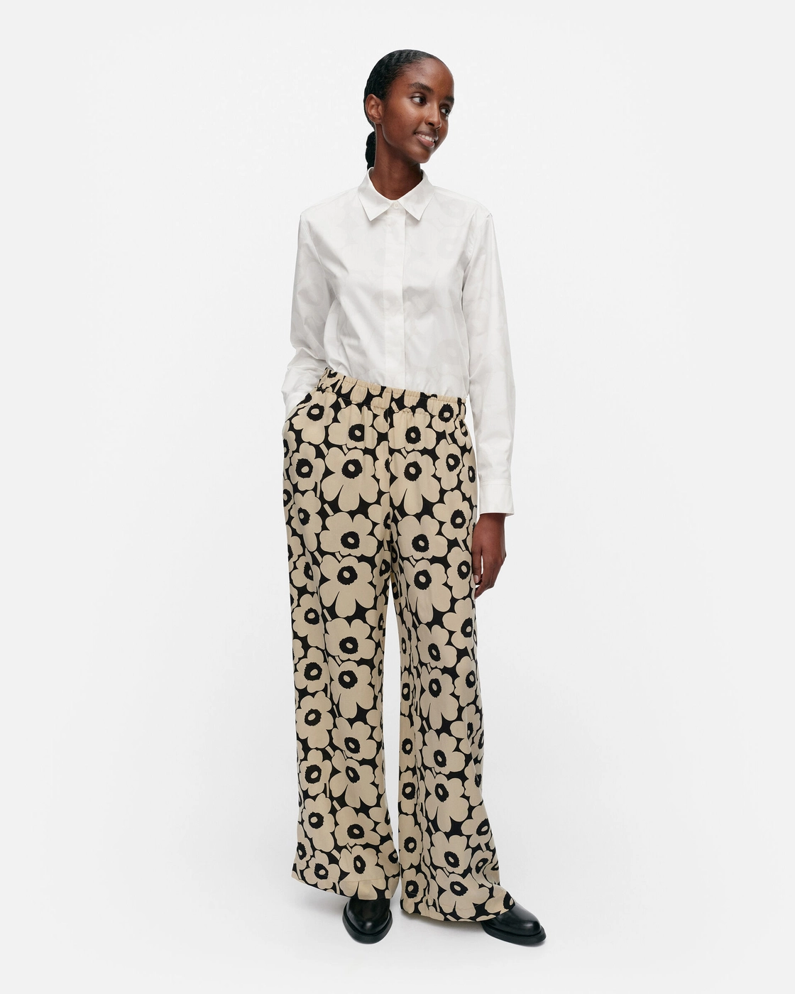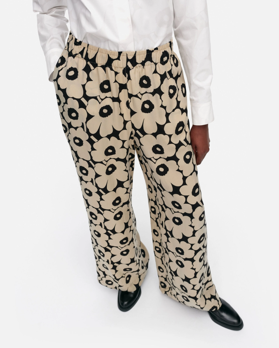 Marimekko Oanet-kuprohousuissa on rento istuvuus, suorat, leveät lahkeet ja Mini Unikko -kuosi. Housuissa on kuminauhavyötärö ja sivusaumataskut.