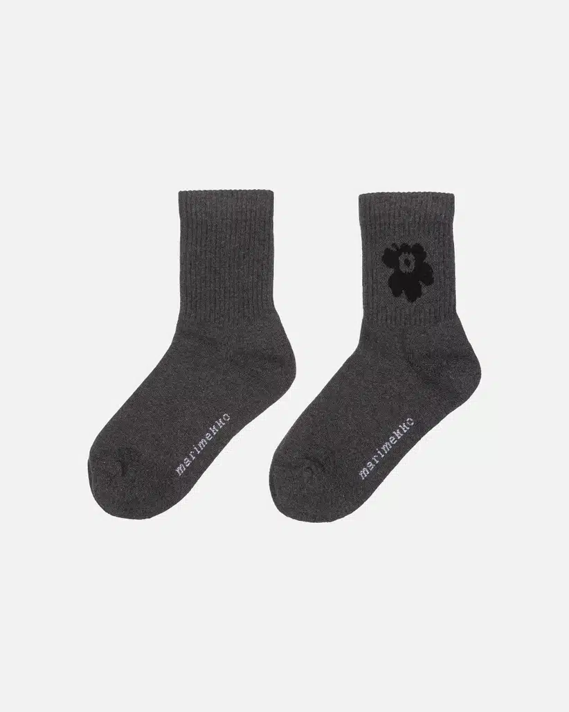 Naisten sukat. Marimekko Puikea-tennissukat on valmistettu puuvillaseoksesta ja niissä on yksi Unikko-kuosin kukka.
