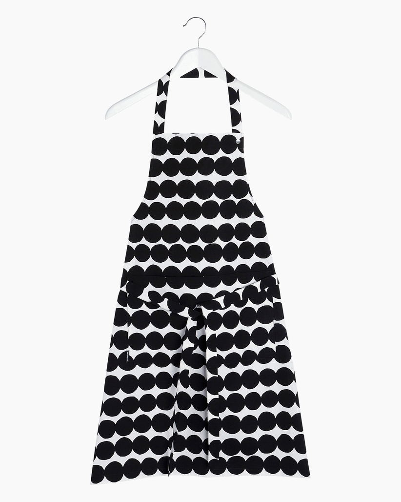 Marimekko esiliinassa on mustavalkoinen Räsymatto -kuosi.