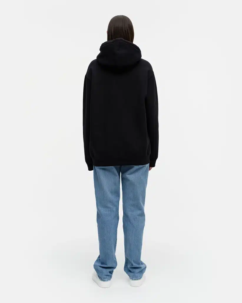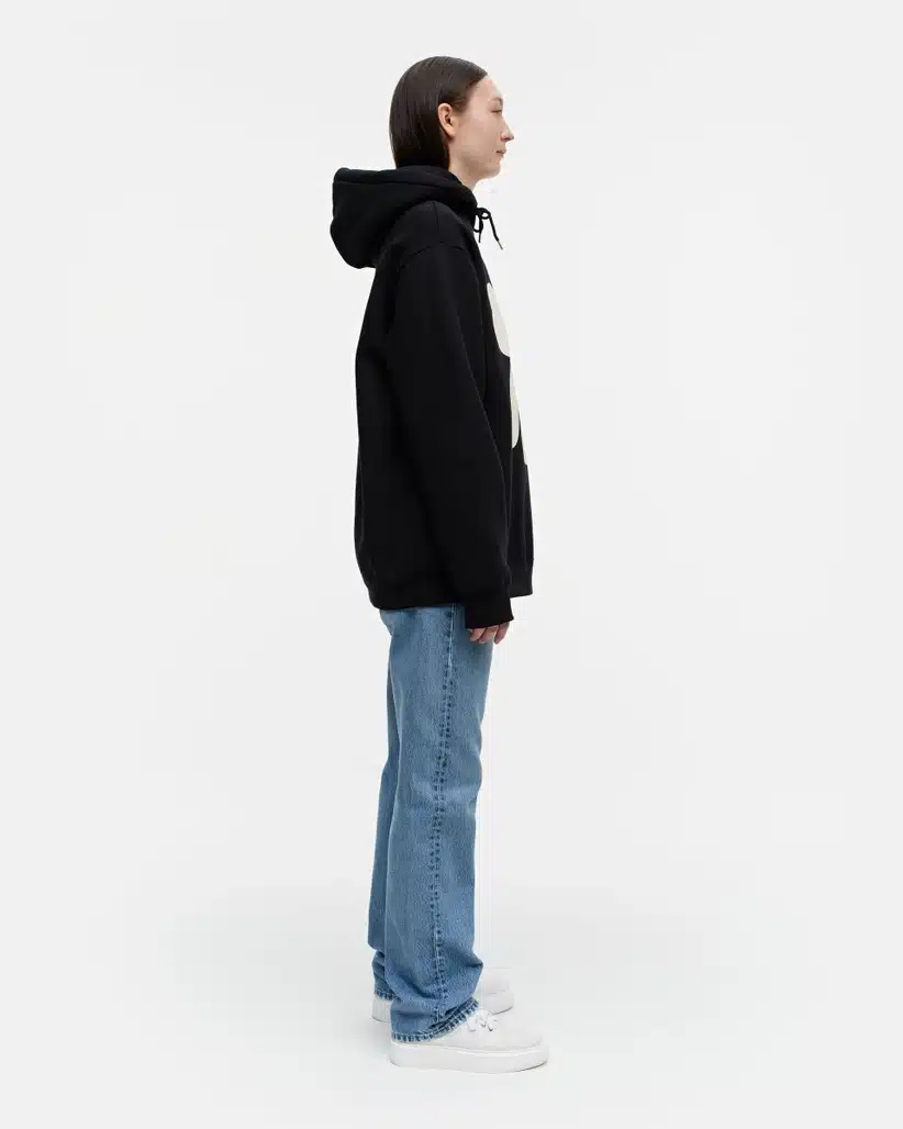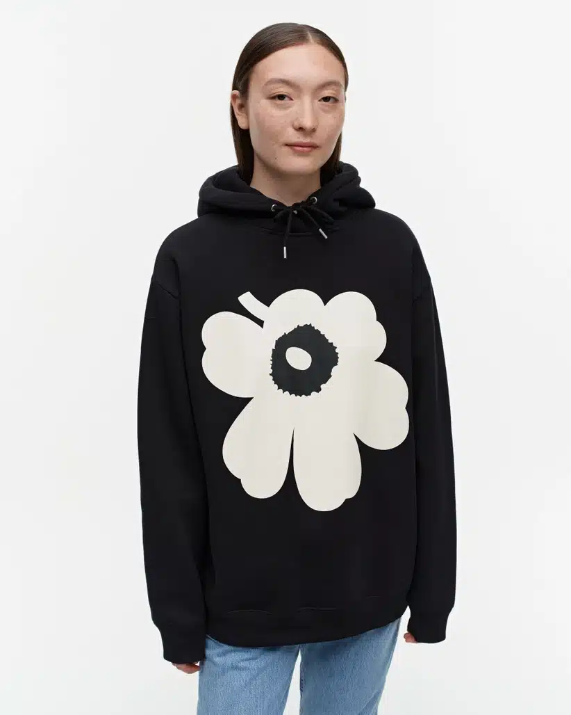Naisten huppari. Marimekko Kioski -sarjan Unikko kuosinen huppari. Rennossa hupparissa on säädettävä huppu sekä suuri Unikko -kuosin kukka rinnassa.