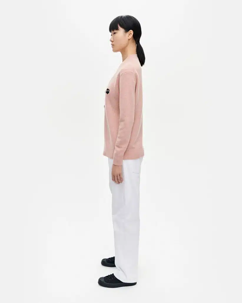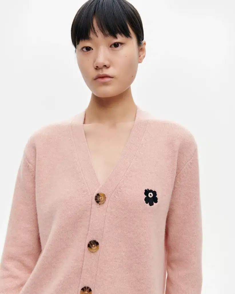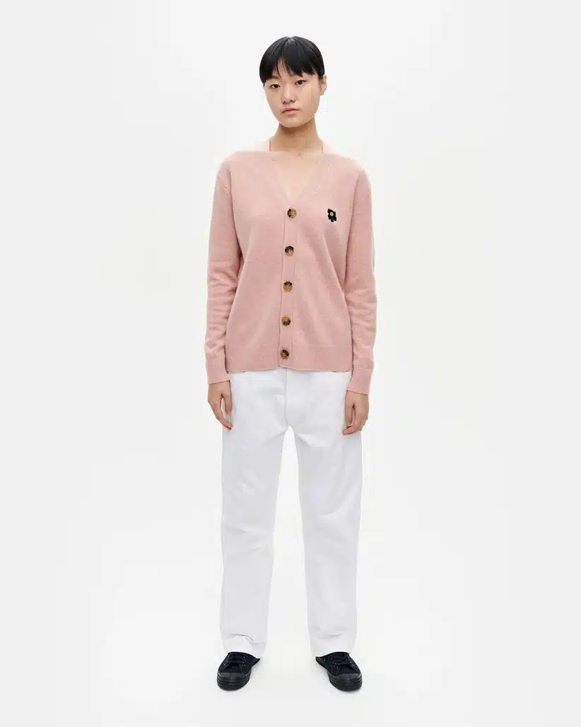 Naisten neuletakki. Marimekko Sif-neuletakki on valmistettu villasekoitteesta ja siinä on pieni brodeerattu Unikko-kuosin kukka etupuolella. Neuletakissa on nappisuljenta ja leveät resorit hihansuissa sekä helmassa. Suoralinjaisessa neuletakissa on rento istuvuus.
