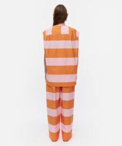 Marimekko Taittua-housut on valmistettu luomupuuvillapopliinista ja niissä on niukka istuvuus ja leveät lahkeet. Housuissa on Galleria-kuosi, kuminauhavyötärö ja sivusaumataskut.