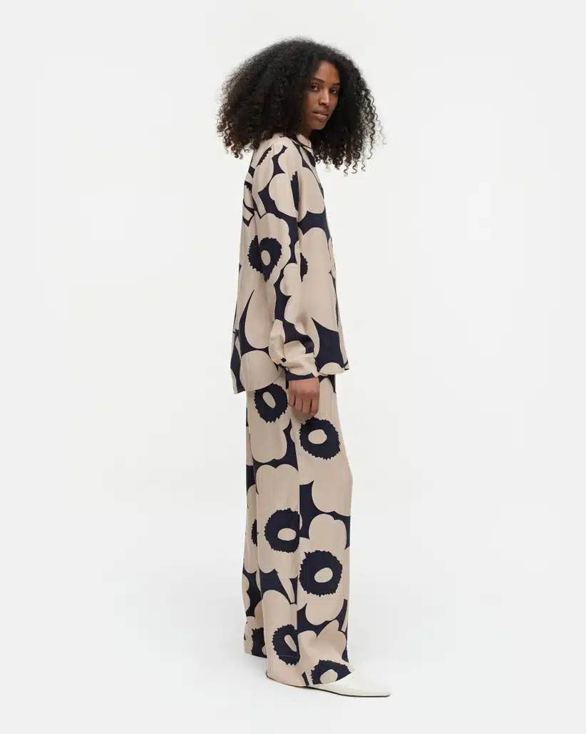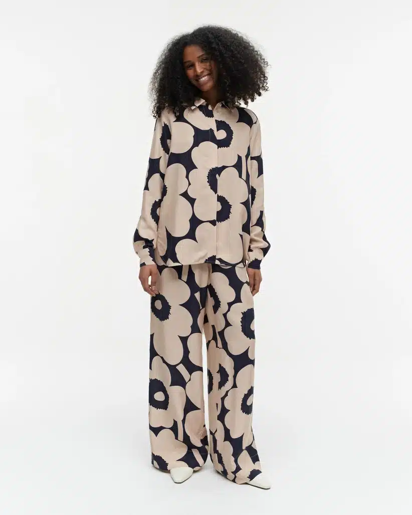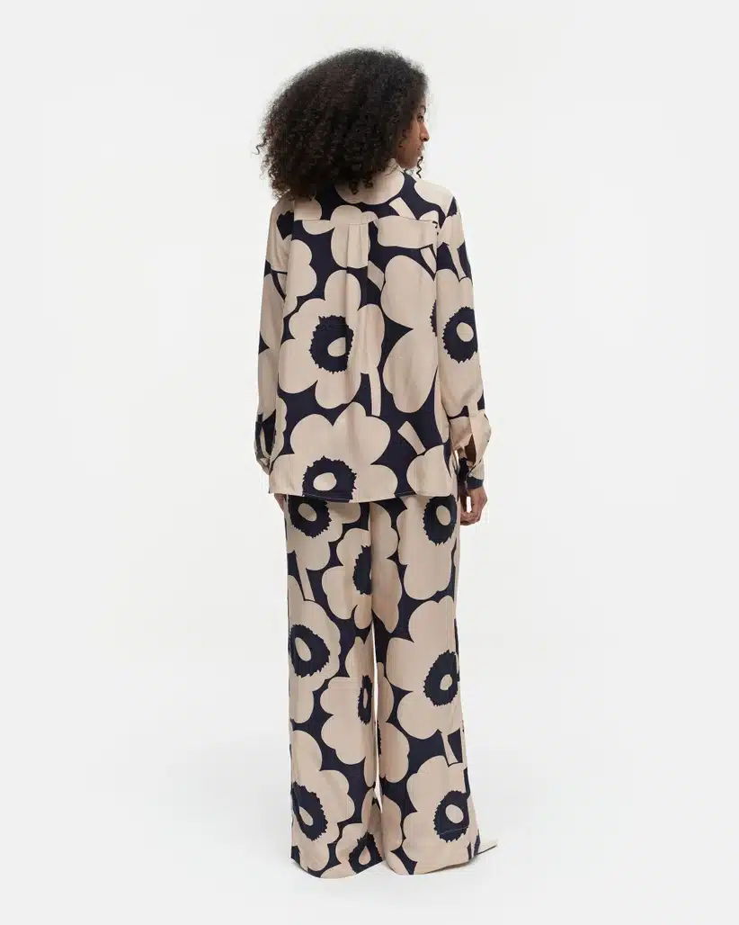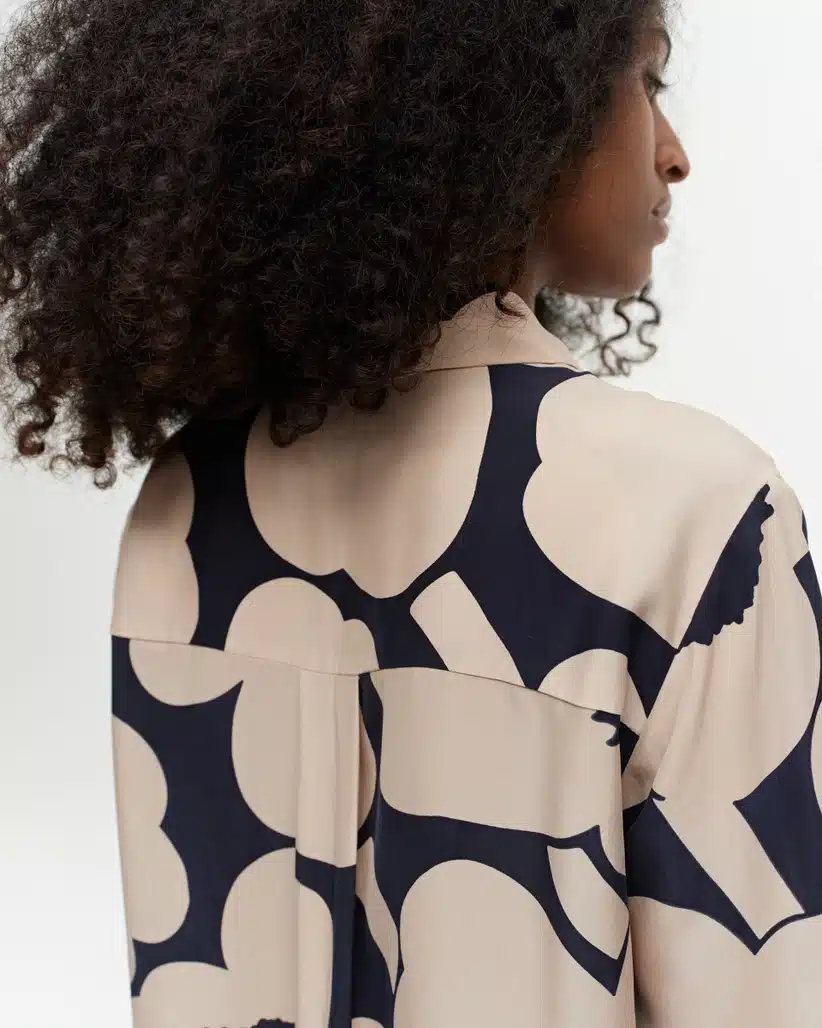 Marimekko paitapusero. Marimekko Unikko-kuosisessa, kuproviskoosista valmistetussa Värssy-paidassa on niukka istuvuus ja suora leikkaus. Paidassa on kaulukset, piilonappisuljenta ja pyöristetty helma. Hihansuissa on mansetit nappisuljennalla.