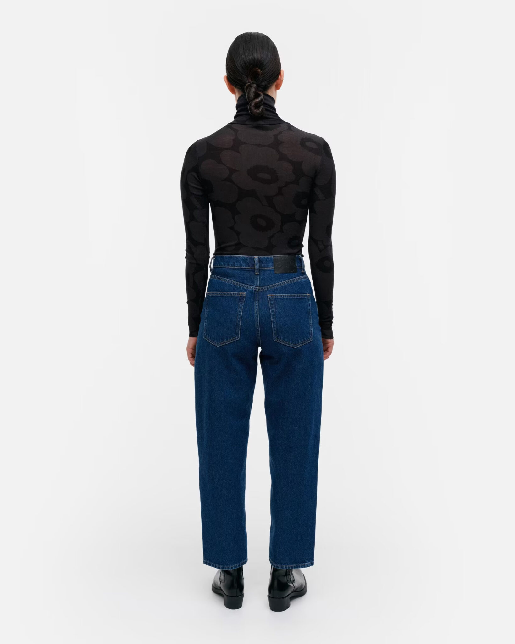 Marimekko Vilina-poolopaita on valmistettu sertifioidusta merinovillaribbistä ja siinä on vartalonmyötäinen istuvuus sekä suora leikkaus. Ohuessa poolopaidassa on Unikko-kuosi ja raakareunat hihansuissa sekä helmassa.