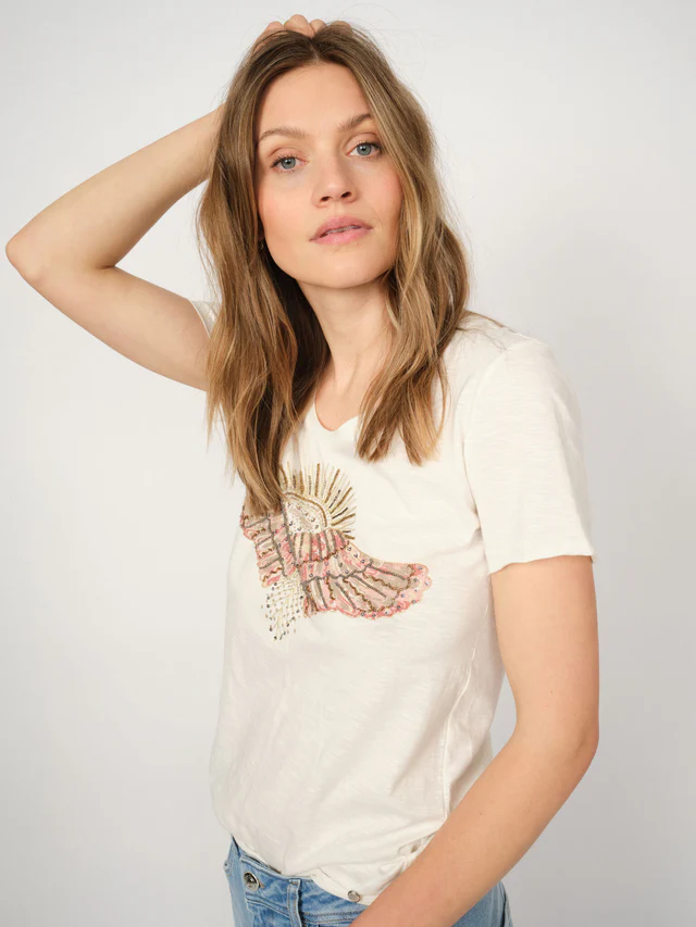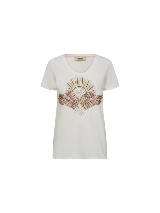 Koristeellinen Mos Mosh t-paita. Rinnassa käsin viimeistelty koristekuosi.