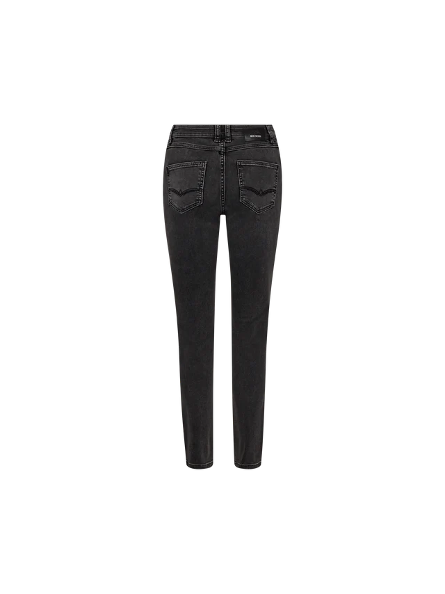 Harmaat Mos Mosh slim-fit farkut. Korka vyötärö, joustava denim laatu.