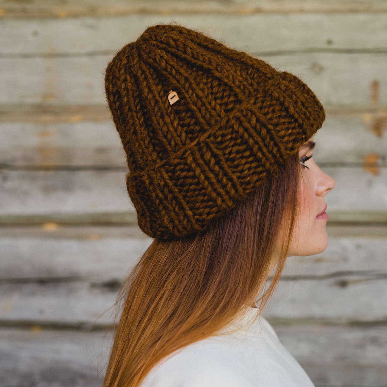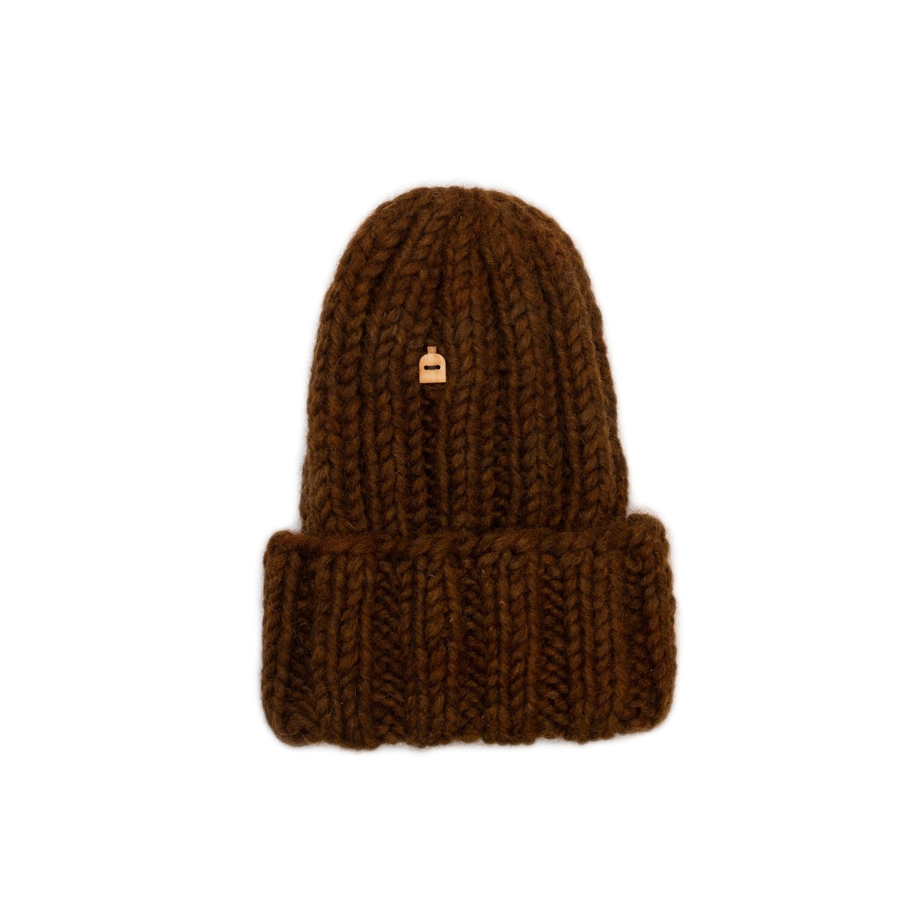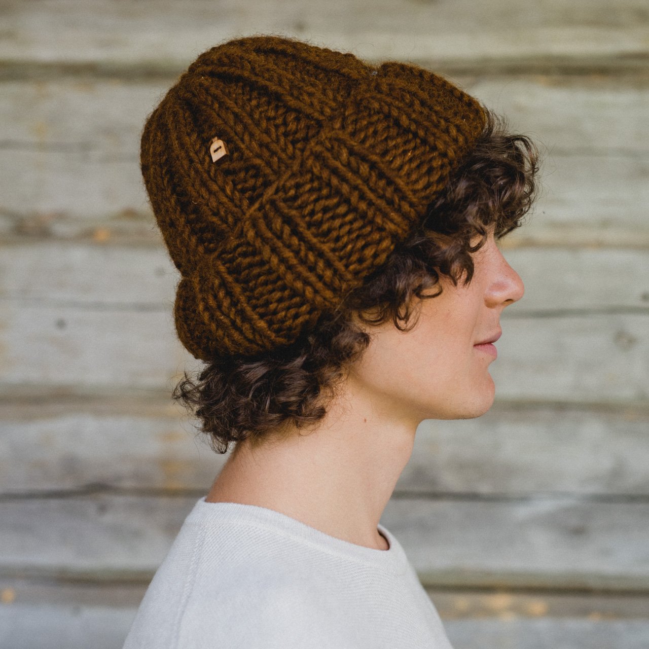 Unisex pipo. Myssyfarmi Muffi Veistäjä on trendikäs kanelinruskea villapipo. Pipossa on pieni puinen Myssyfarmi -logo.