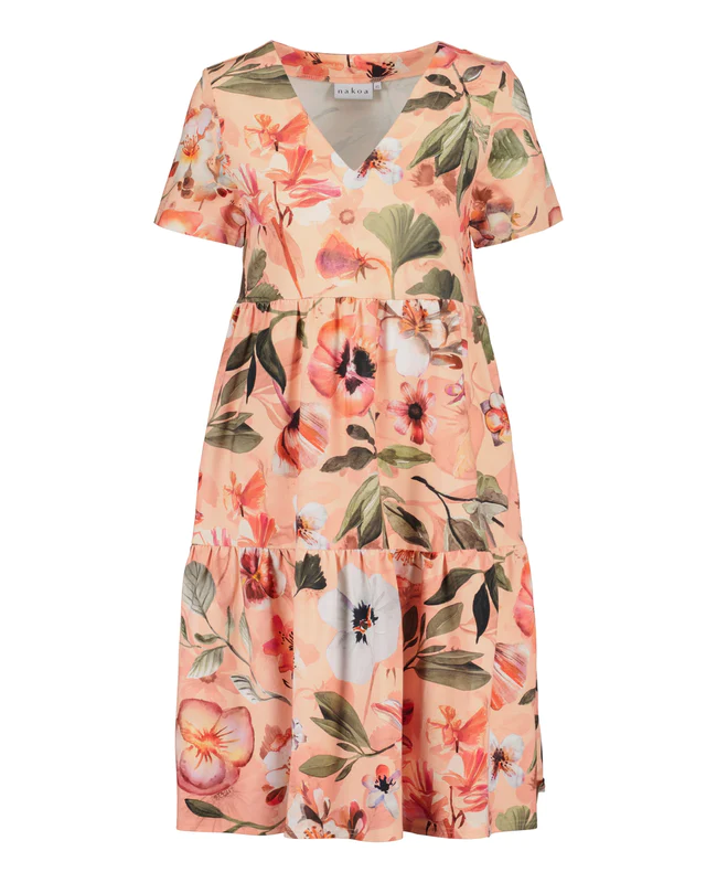 Nakoa kerrosmekko tuo ripauksen luksusta arkeen. Kuosi sopii täydellisesti niin helteiseen kesäpäivään kuin viilenevään kaupunki-iltaan. GOTS-sertifioitu puuvilla on pehmeä ja laadukas materiaali, joka tuntuu ihoa vasten mukavan hengittävältä ja kevyeltä. Kerrokset toimivat viehättävänä yksityiskohtana ja luovat kauniin siluetin.