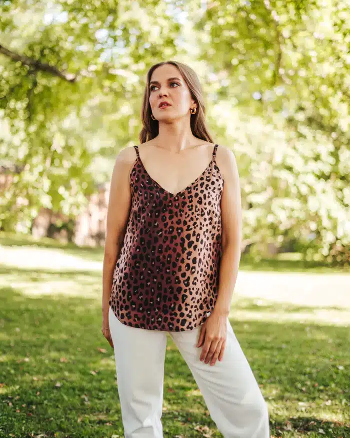 Leopardikuosinen Nakoa spagettiolkaintoppi. Laskeutuvaa, kaunista lyocellia.