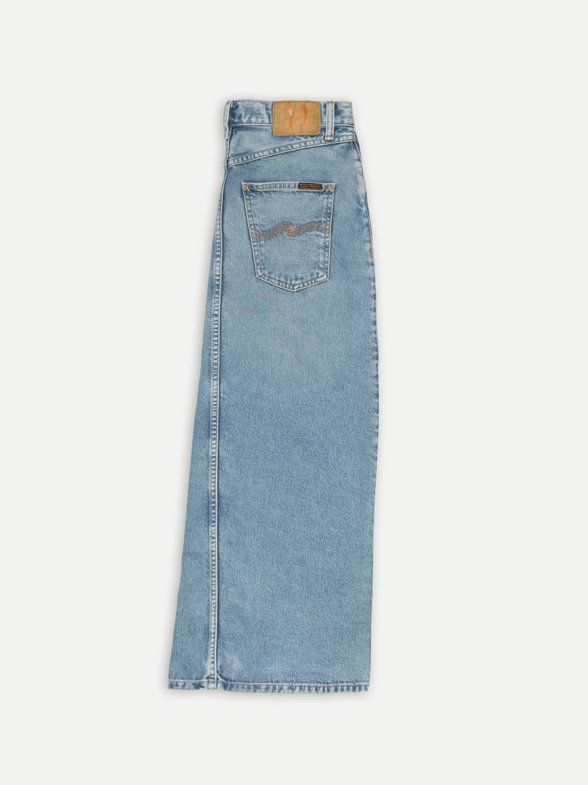 Korkeavyötäröinen Nudie Jeans farkkuhame luomupuuvillaa.